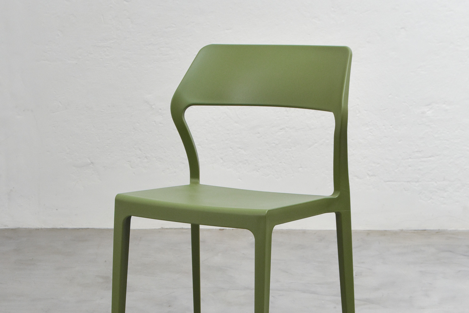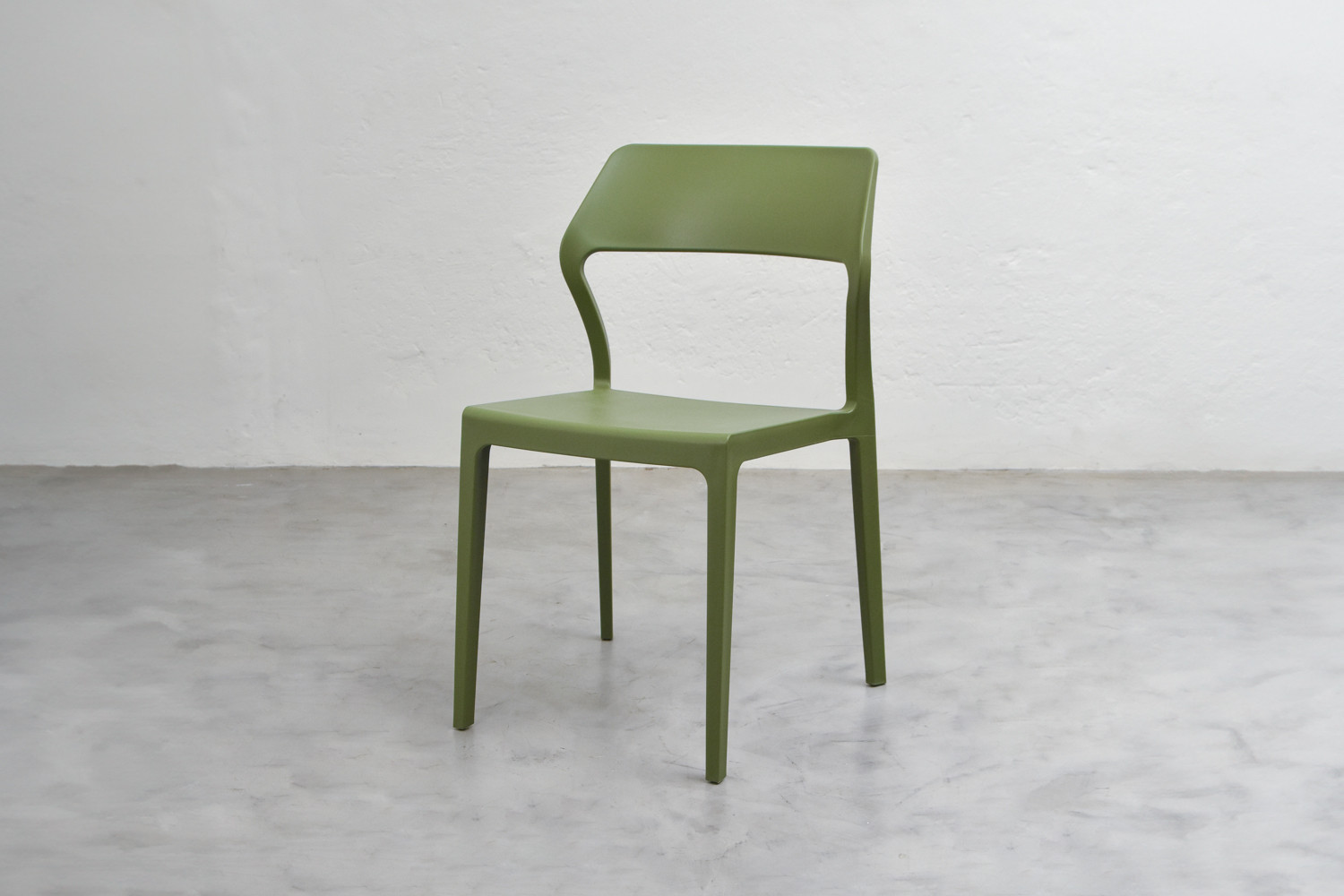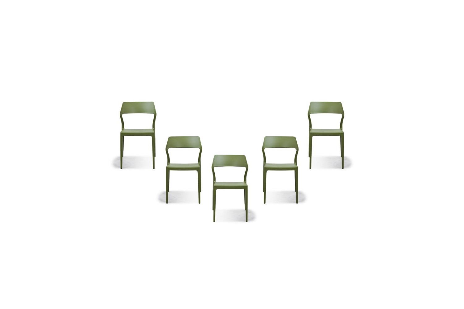 This set of dining chairs is crafted from polypropylene and can be stacked for easy storage.