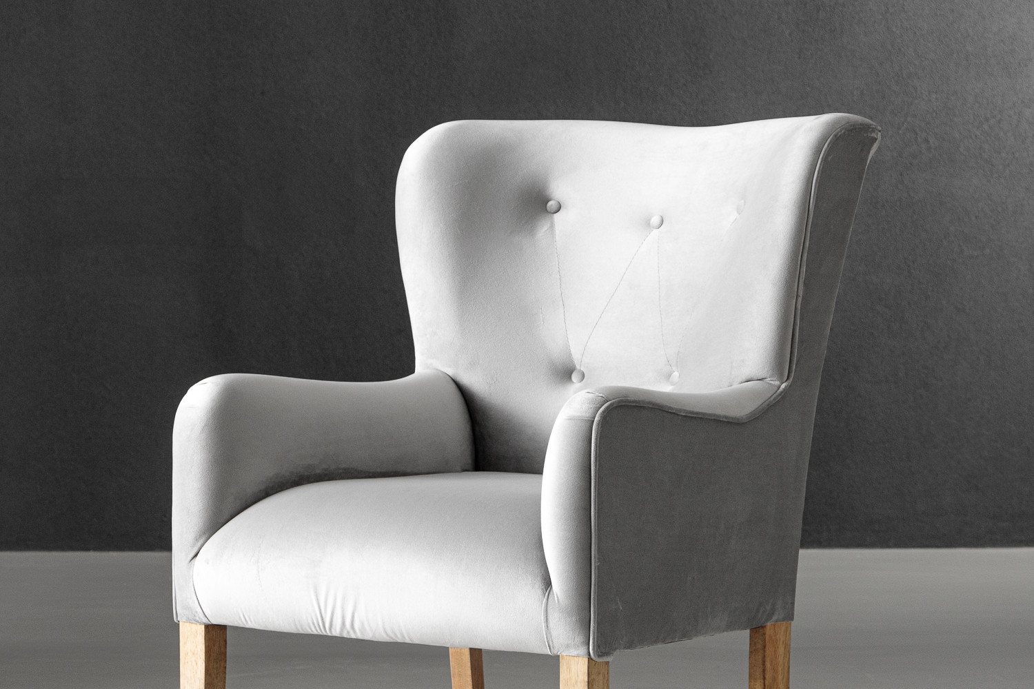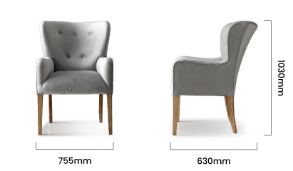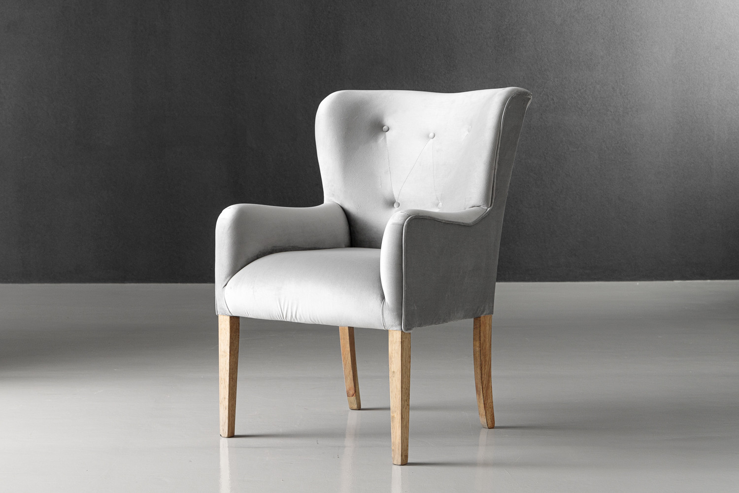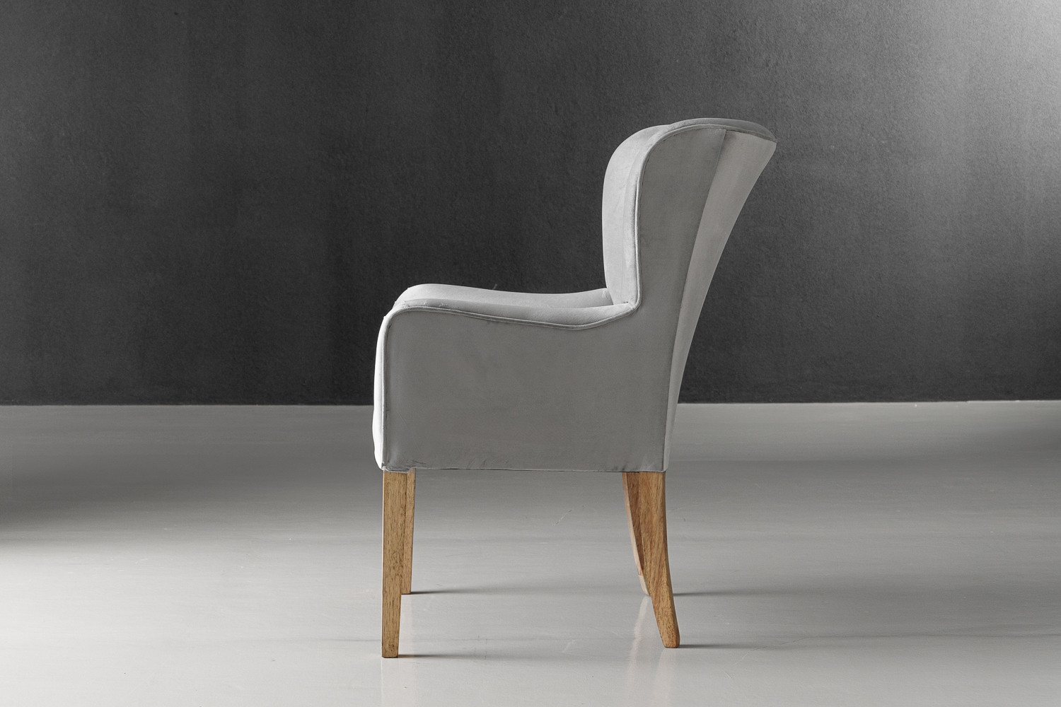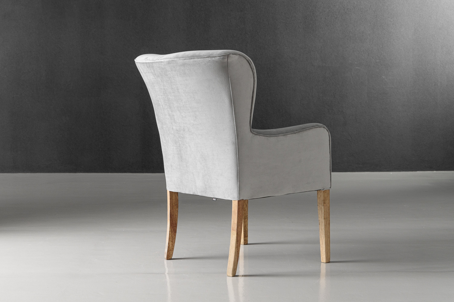 This dignified dining chair boasts a stylish wingback design with armrests, a comfortable padded seat, and backrest. The Emma Dining Chair features a solid rubberwood frame with summer oak-stained legs, and the piece is all wrapped up in high-quality fabric.