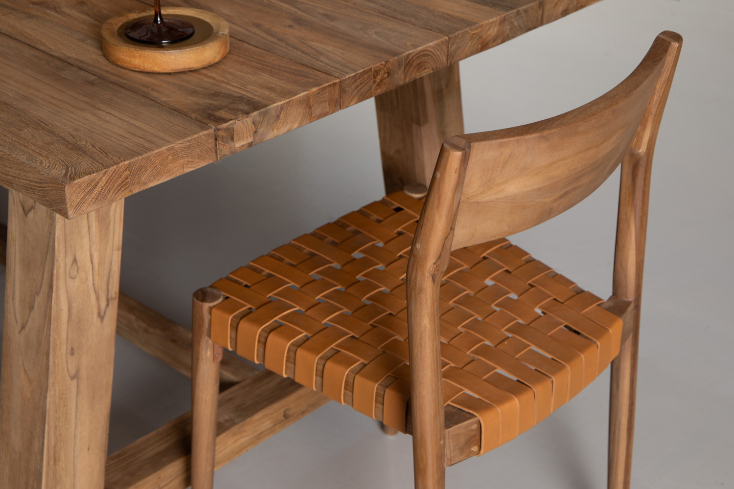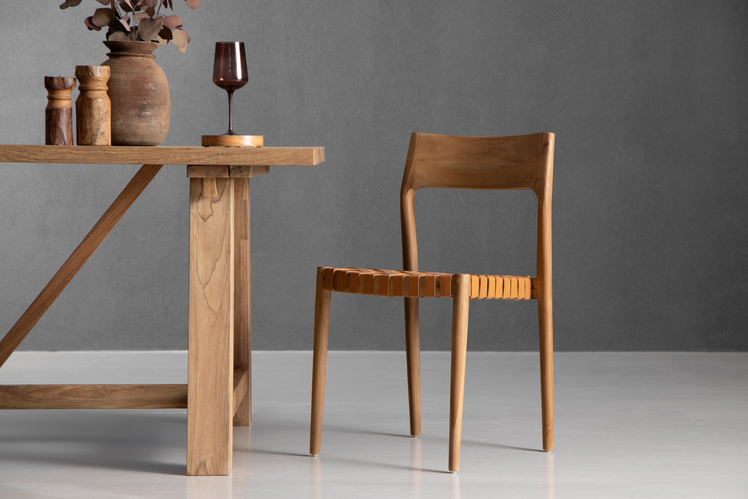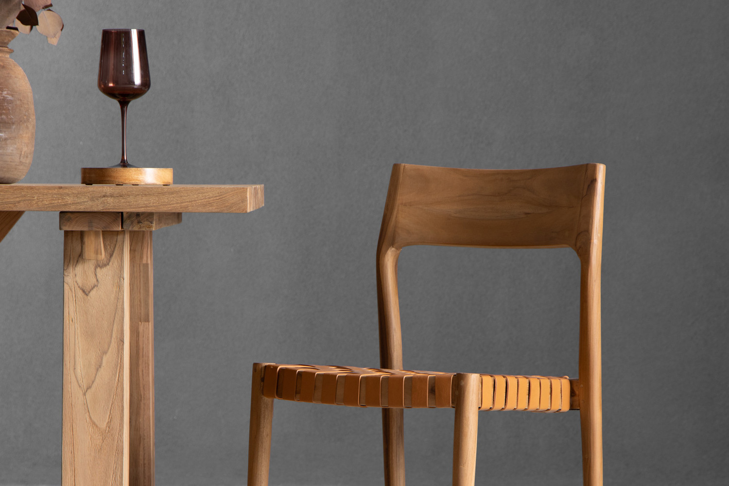 The Lento Leather Dining Chair is a paragon of modern design, blending natural teak wood and full grain leather in perfect harmony. Its clean lines and elegantly woven seat give it a luxurious feel without sacrificing functionality. Enjoy long dinners and engaging conversation in utmost comfort.