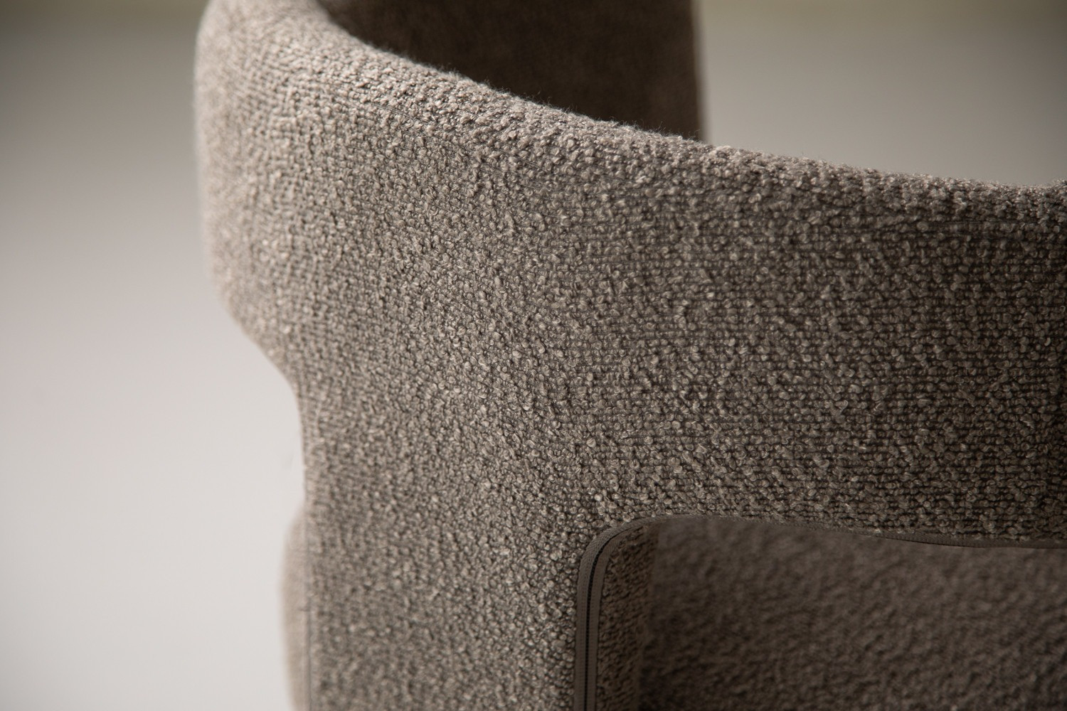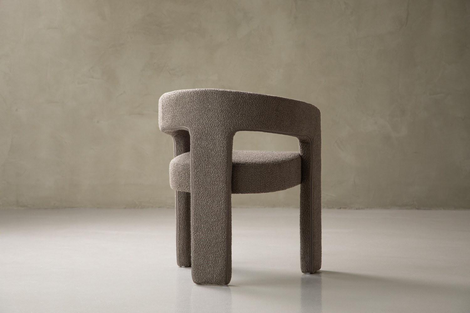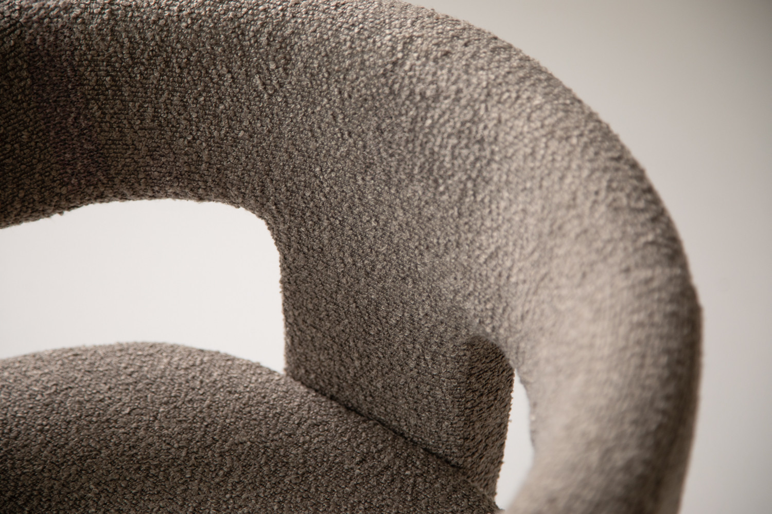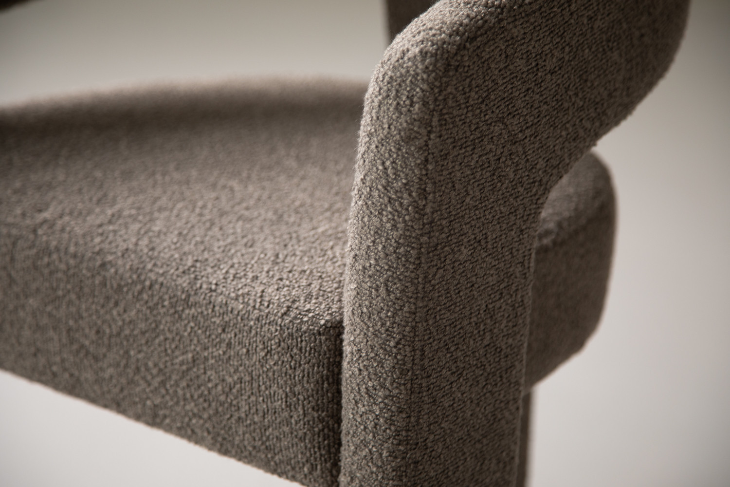 The Marlow Dining Chair pairs a sculptural barrel-back silhouette with plush bouclé upholstery in a grey hue. It blends contemporary curves with everyday durability, featuring padded comfort with a supportive wraparound back and open-arm detail. The tactile bouclé finish provides cosy texture, along with a strong sense of personality.