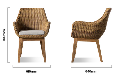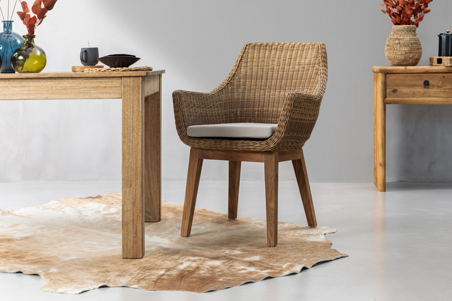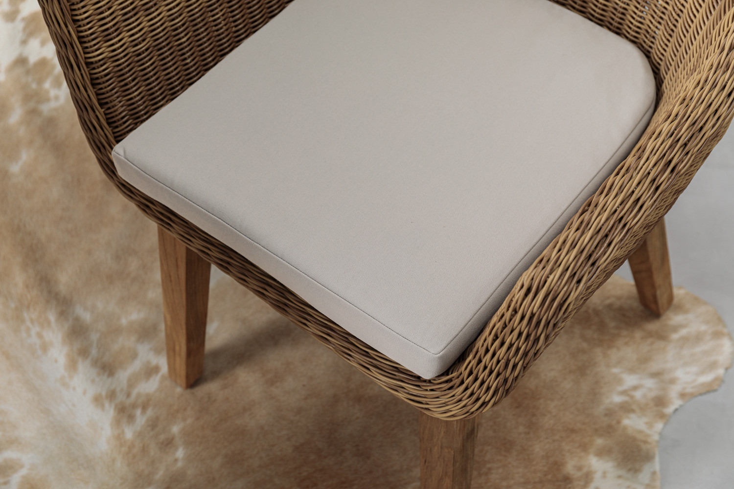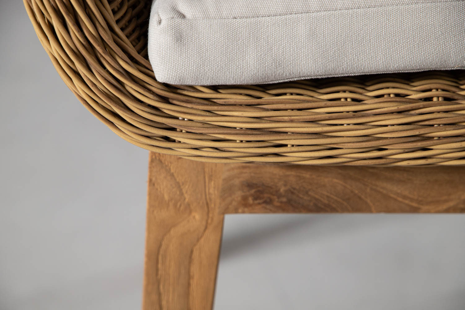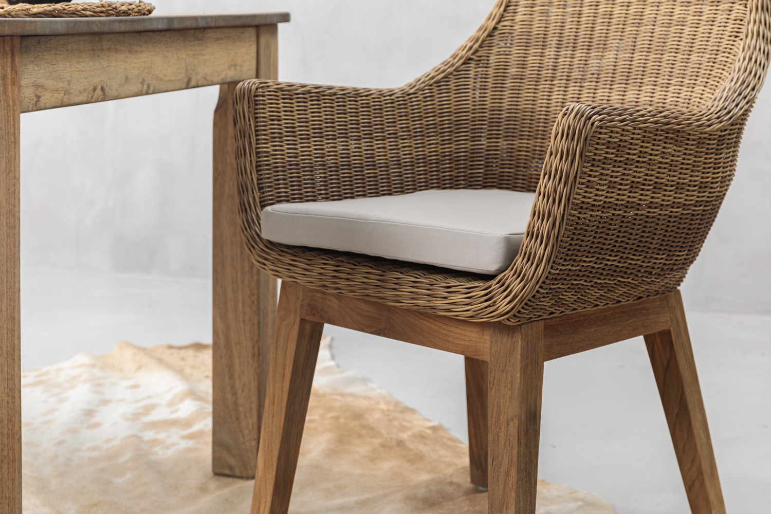 The Morgan Armchair is a versatile addition to your patio or dining space. Crafted with solid Teak wood legs and a woven PE rattan seat, it seamlessly combines durability with a touch of modern flair. Its plush accent seat cushion enhances comfort, making it perfect for dining, occasional seating, or patio lounging.