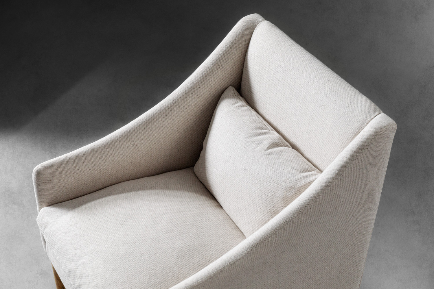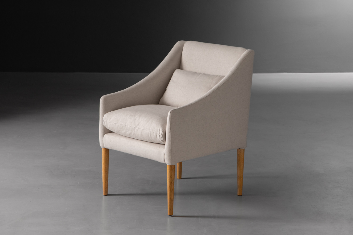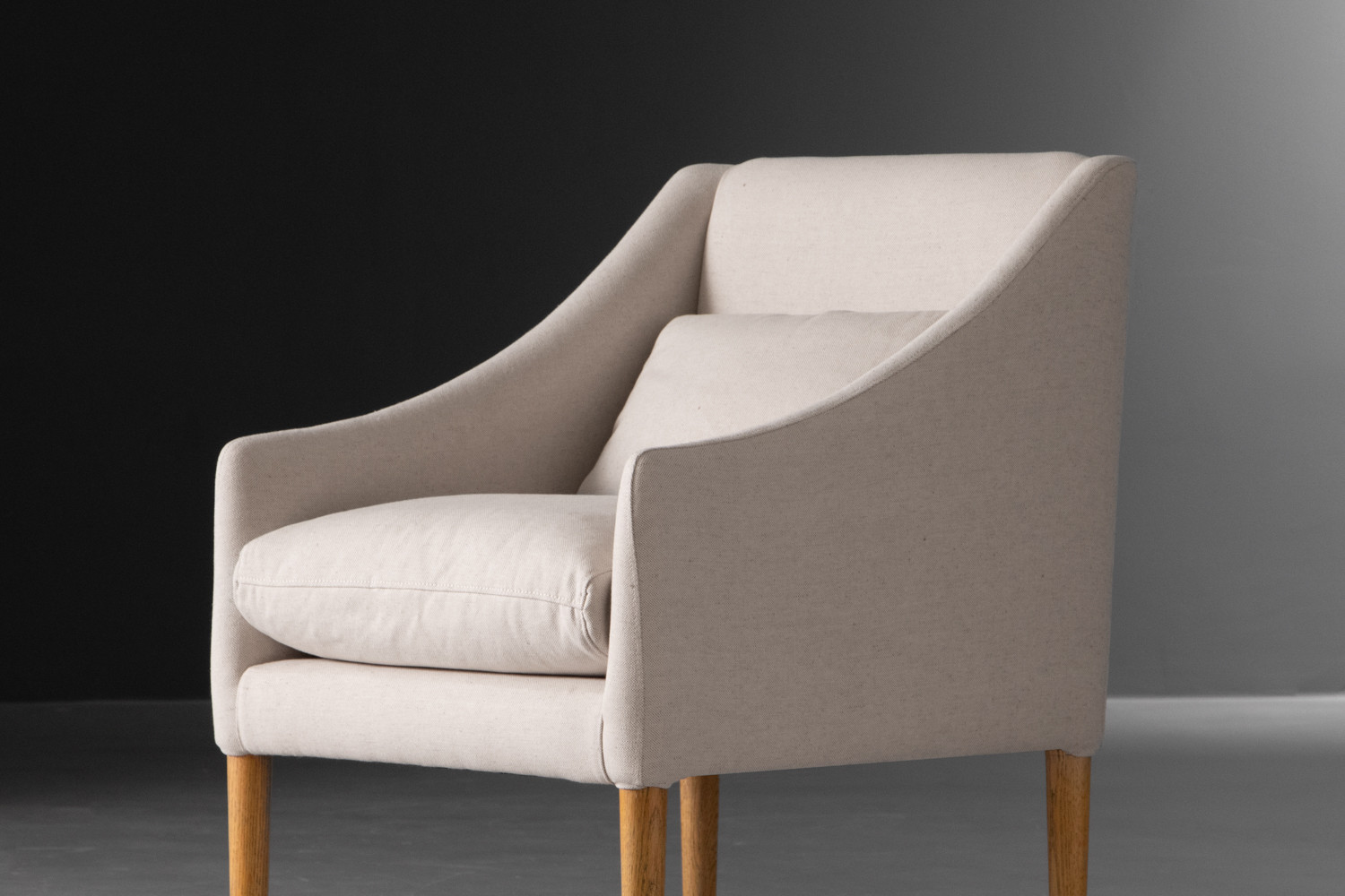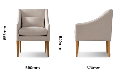 The Scarlett Dining Chair offers a perfect blend of refined design and plush comfort, making it an ideal addition to any living room, bedroom, or office space. It could even be used as a supremely comfortable dining chair. Upholstered in a luxurious Savannah coloured fabric, this dining chair features gently curved armrests and soft cushioning that provide both aesthetic appeal and ergonomic support. The solid ash wood frame adds a sturdy foundation while maintaining a modern, minimalist look. Designed for contemporary interiors, the Scarlett dining chair combines style and functionality for a versatile seating option.