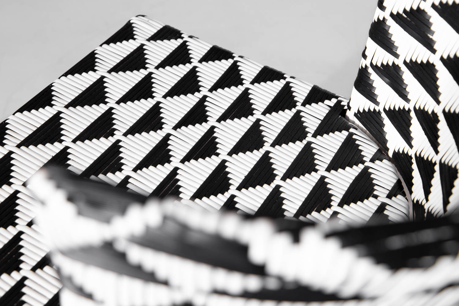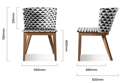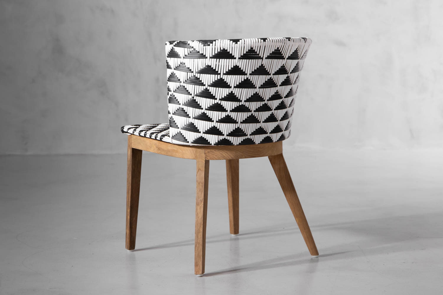 The Zena Dining Chair is a modern spin on bistro-style. Featuring a black and white triangular pattern woven with PE rattan, the Zena sits atop a Teak wood frame. This vibrant chair fits perfectly in a dining set, while being striking enough to work as a stand-alone piece.