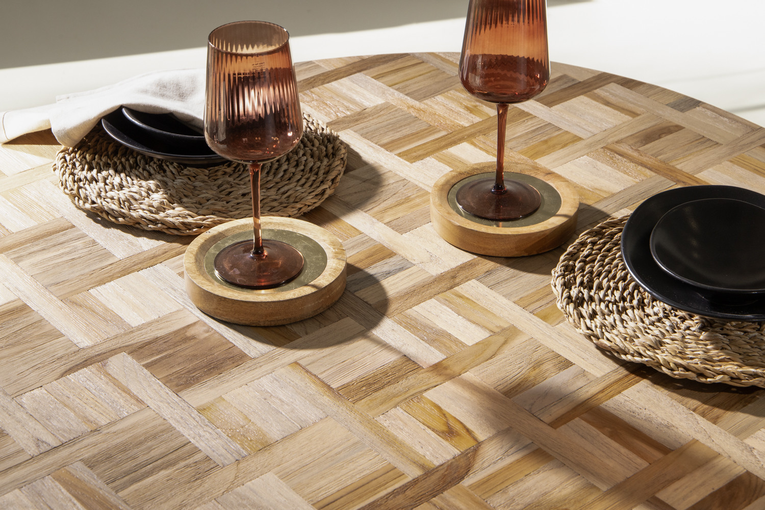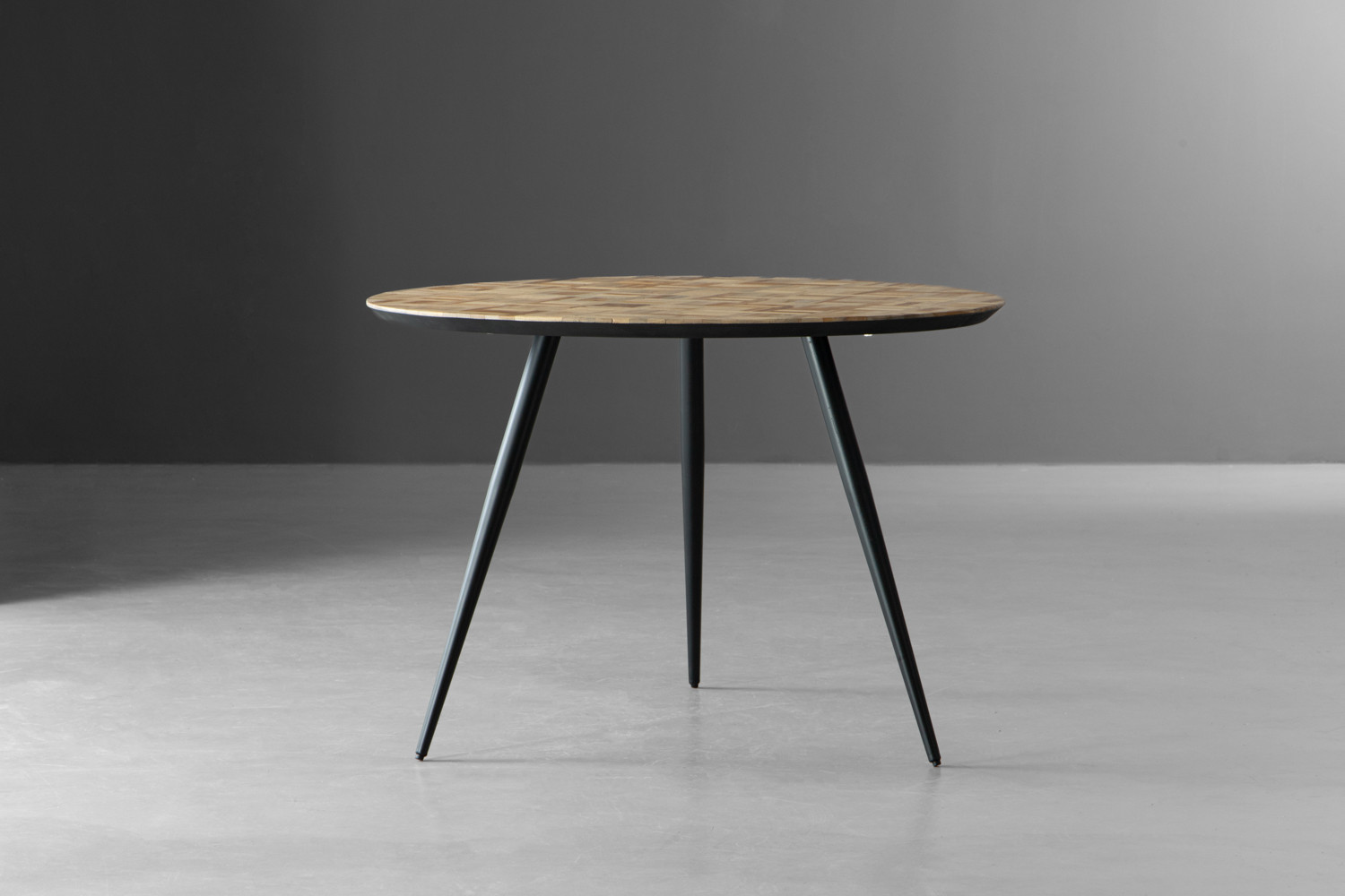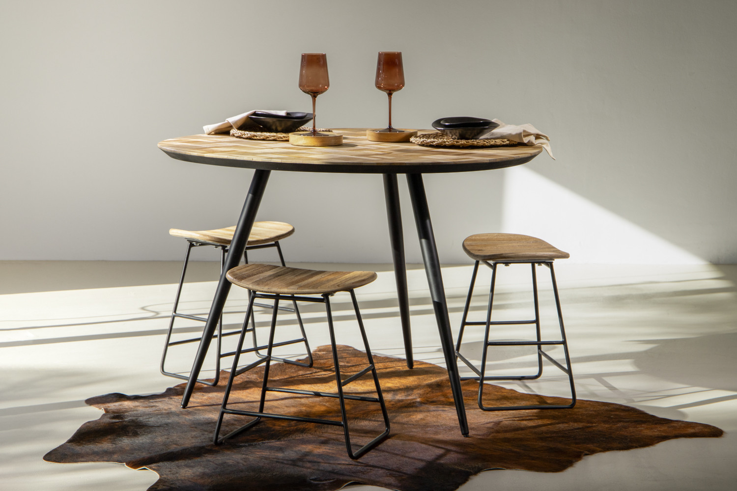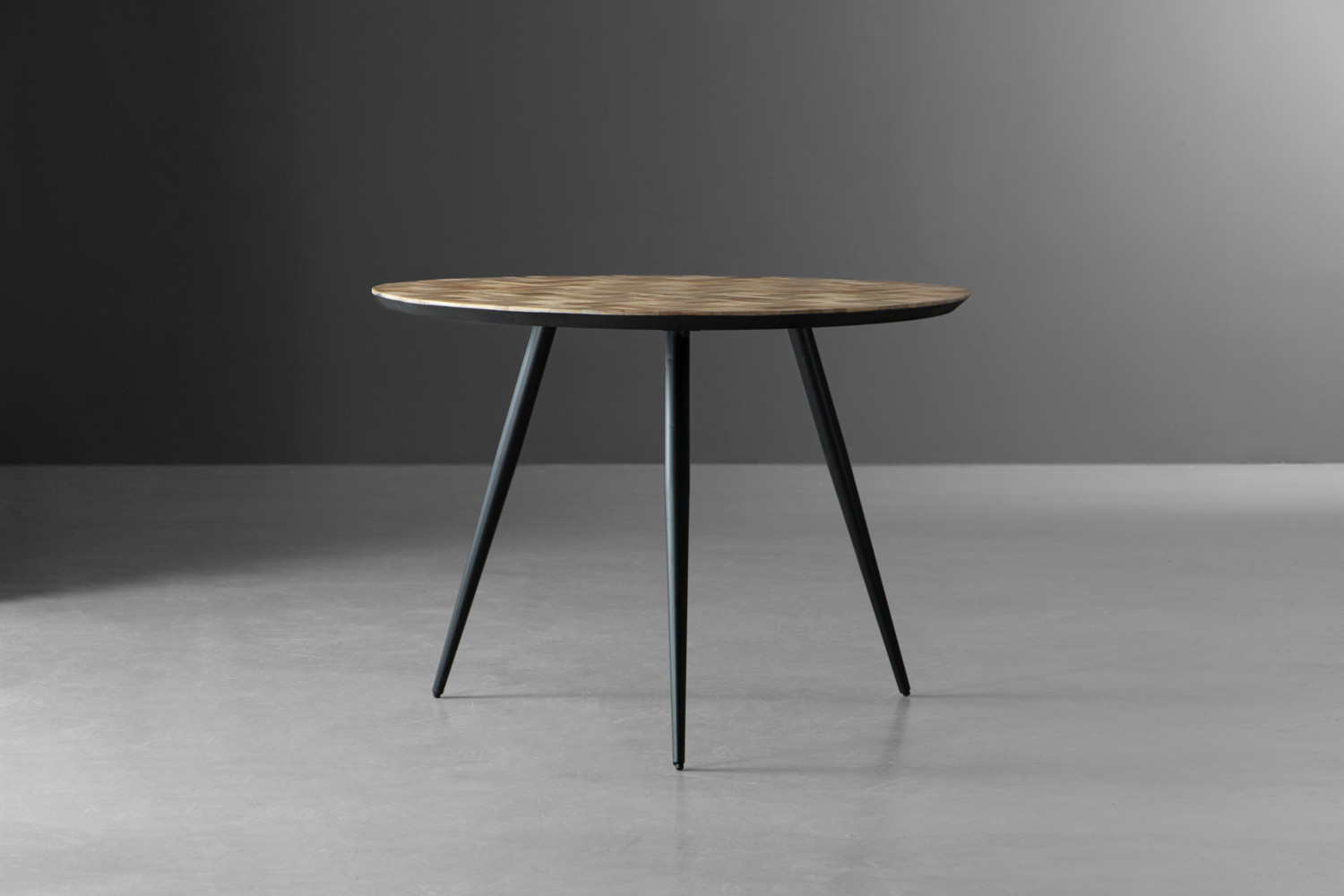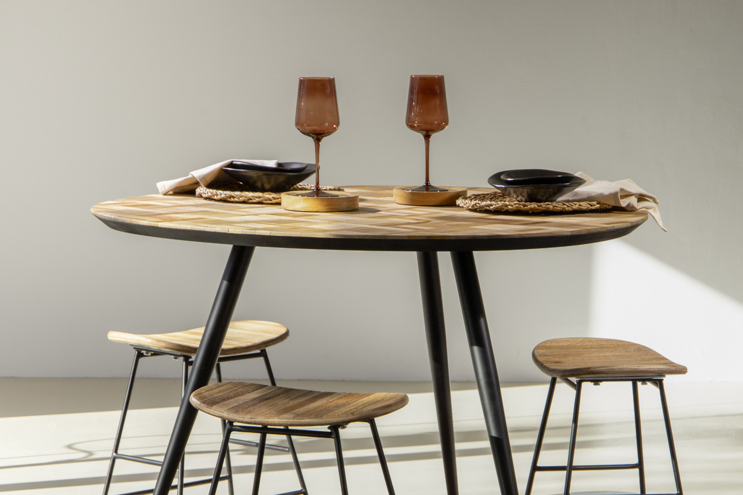The Cillian Dining Table is a showcase for elegant simplicity in furniture design. Its parquet-style tabletop, crafted from solid teak wood, is perfectly contrasted against its black mild steel legs. It's a combination that gives the table attractive poise in both modern and traditional interiors.