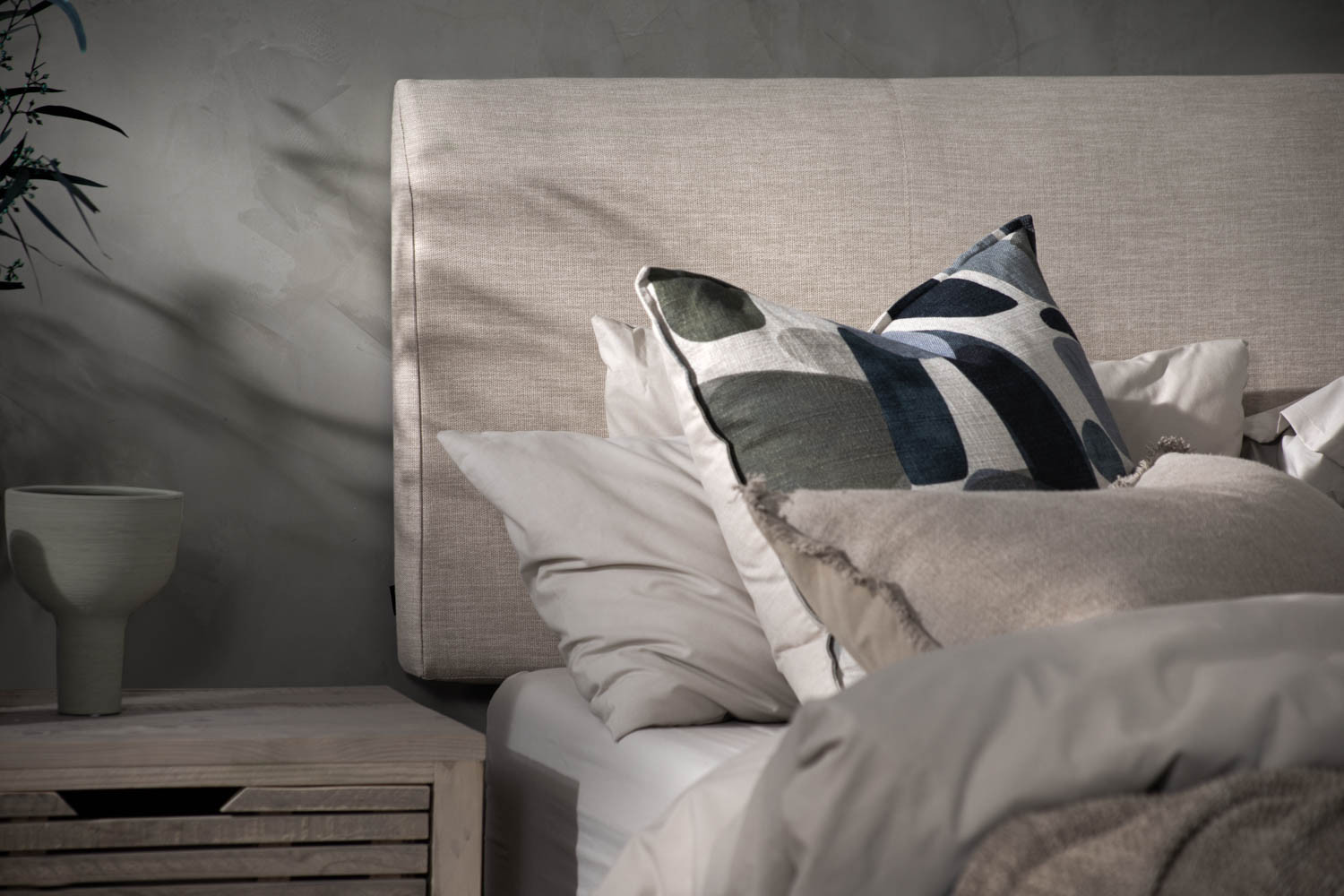 Wall-mounted headboard available in various colours and fabrics.