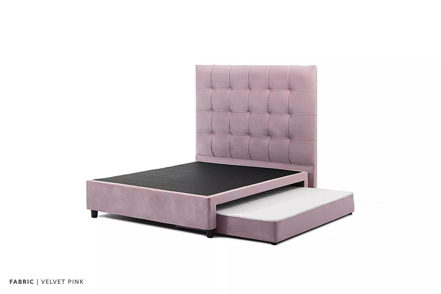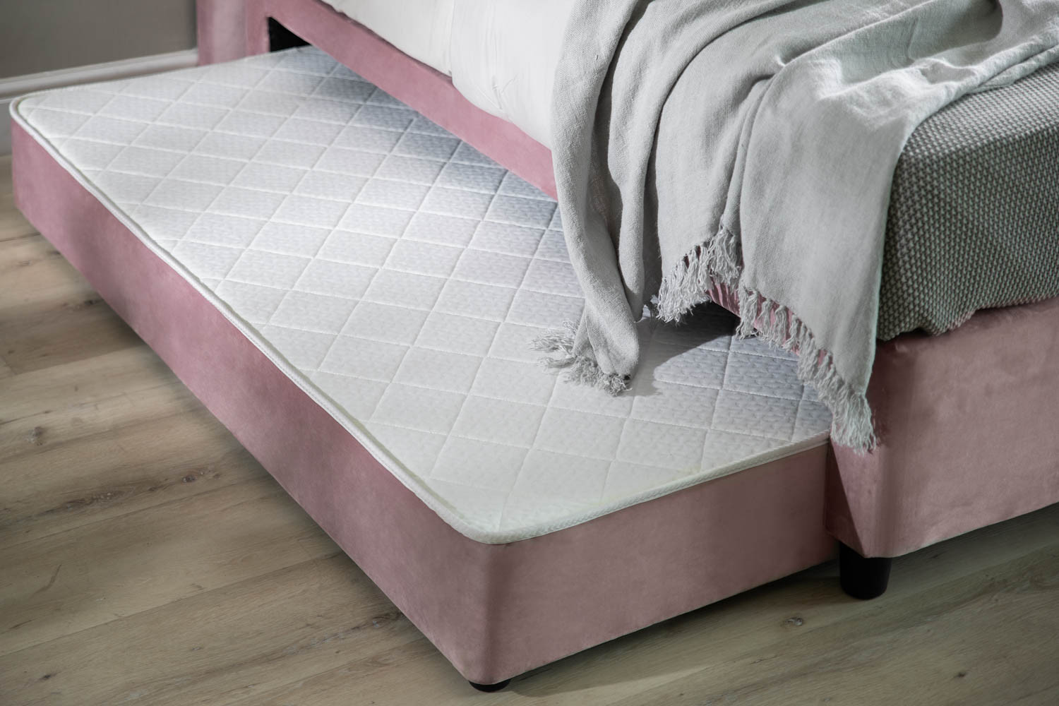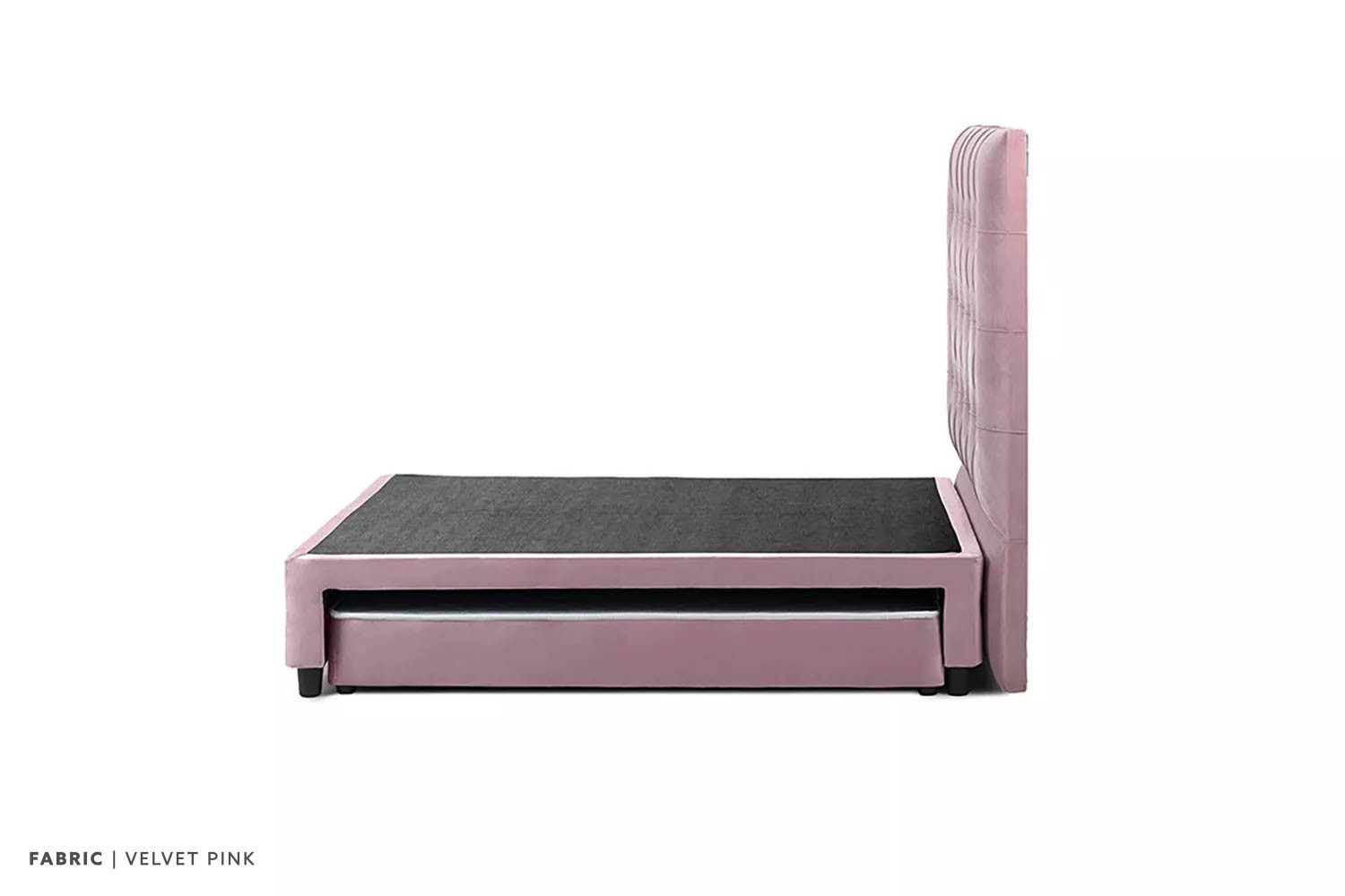 - A modern, upholstered bed base with an additional sleek pull-out bed base