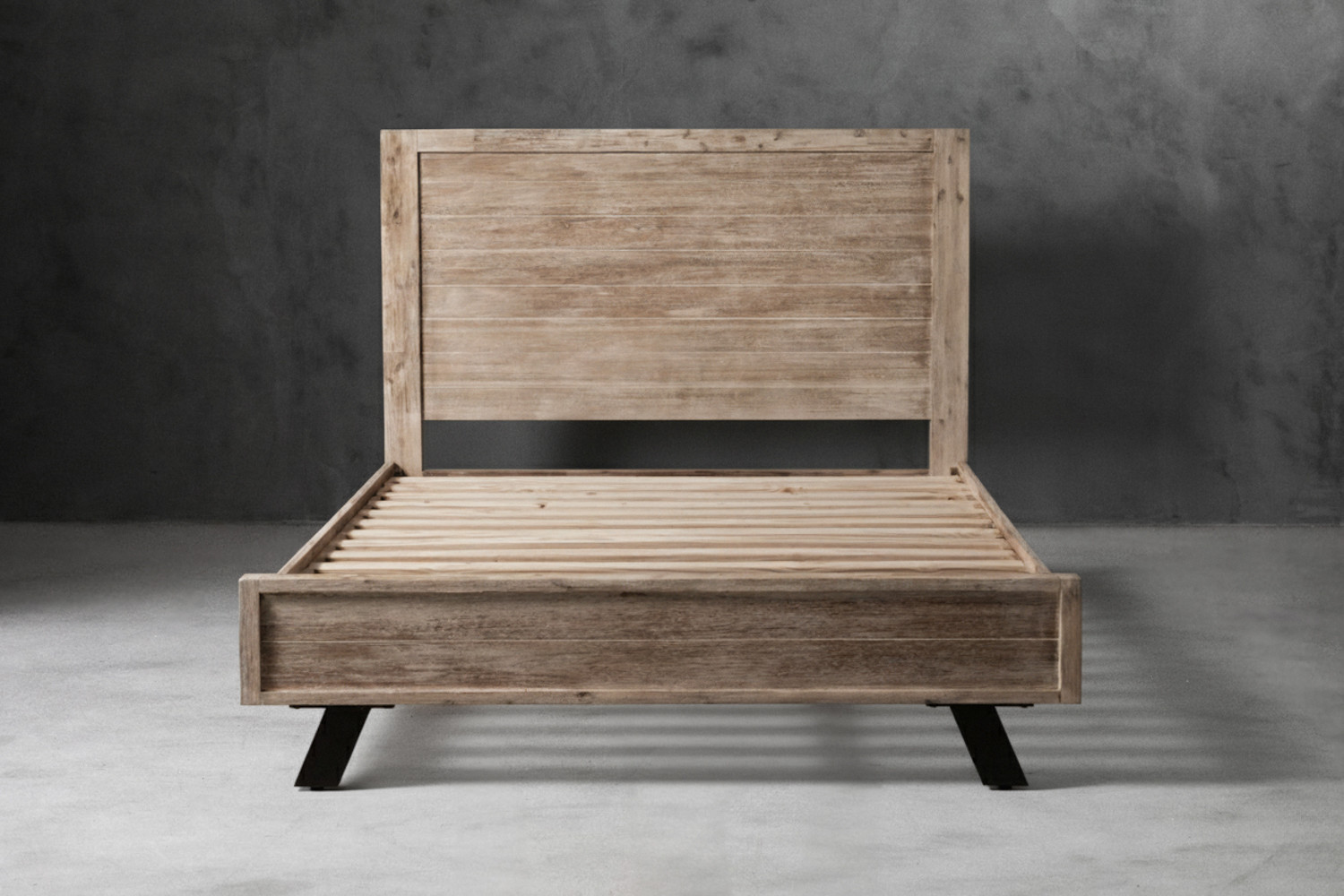 Crafted from durable solid acacia and enhanced with acacia veneers, the Ashford Bedroom Combo brings warm, natural grain to any bedroom. The bed base features a robust platform with wooden slats for breathable support, anchored on contrasting steel legs. The tactile, wire-brushed finish softens the profile and suits a wide range of linen palettes.