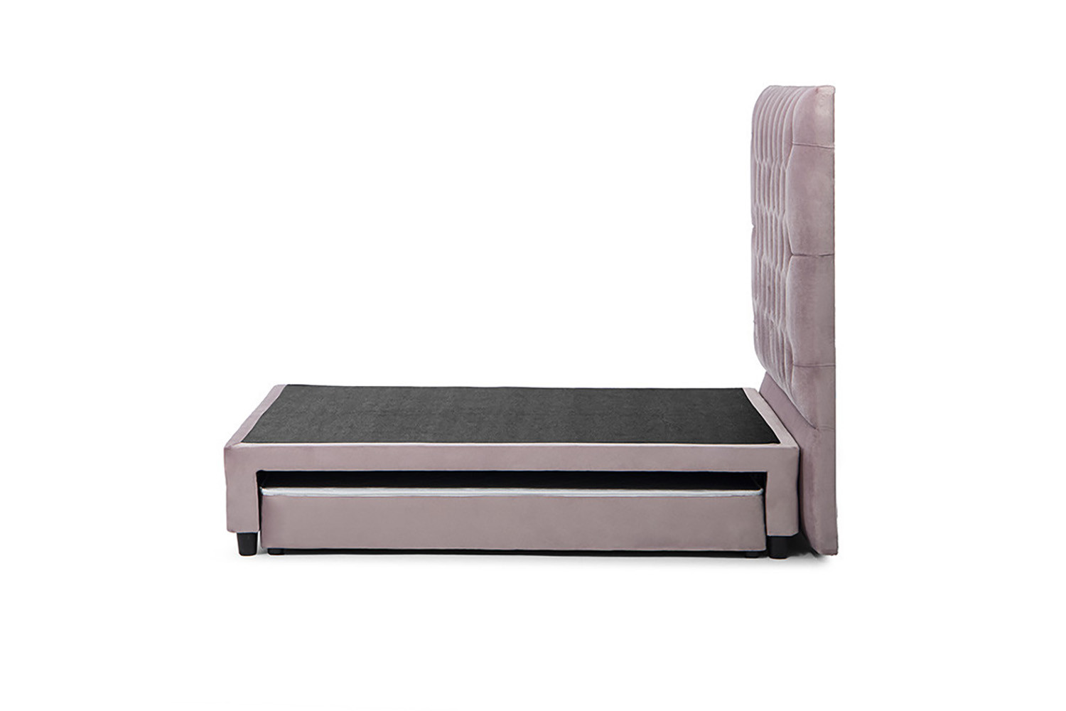 The Skyler stands out for its useful pull-out bed or 'trundle' that fits snuggly within its luxe frame. This extra or second pull-out bed contains a built in 225mm High-density foam diamond quilted mattress, upholstered in matching high quality velvet polyester.