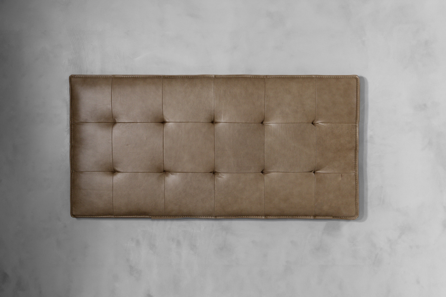 The Warwick Leather Headboard welcomes a contemporary statement piece to your bedroom. This wall-mounted full grain leather headboard features distinctive reversed seam stitching and blind tufting. This headboard's natural raw look is produced by its premium leather exterior.