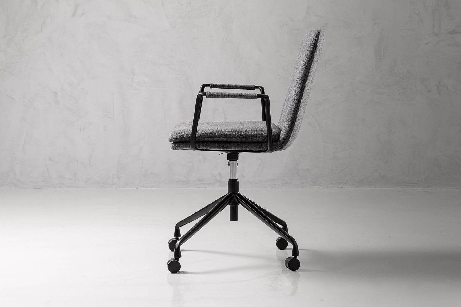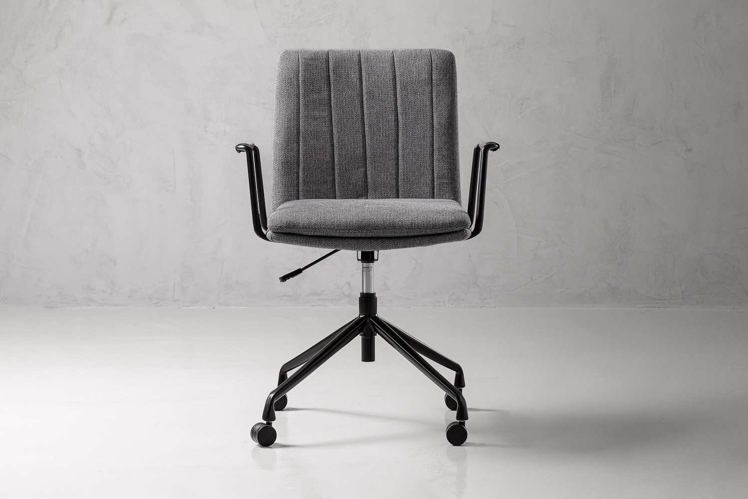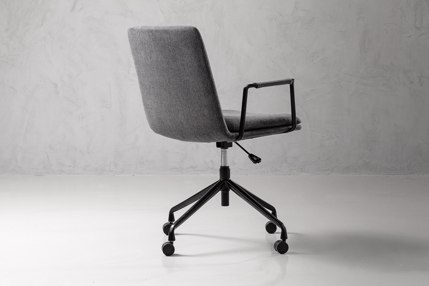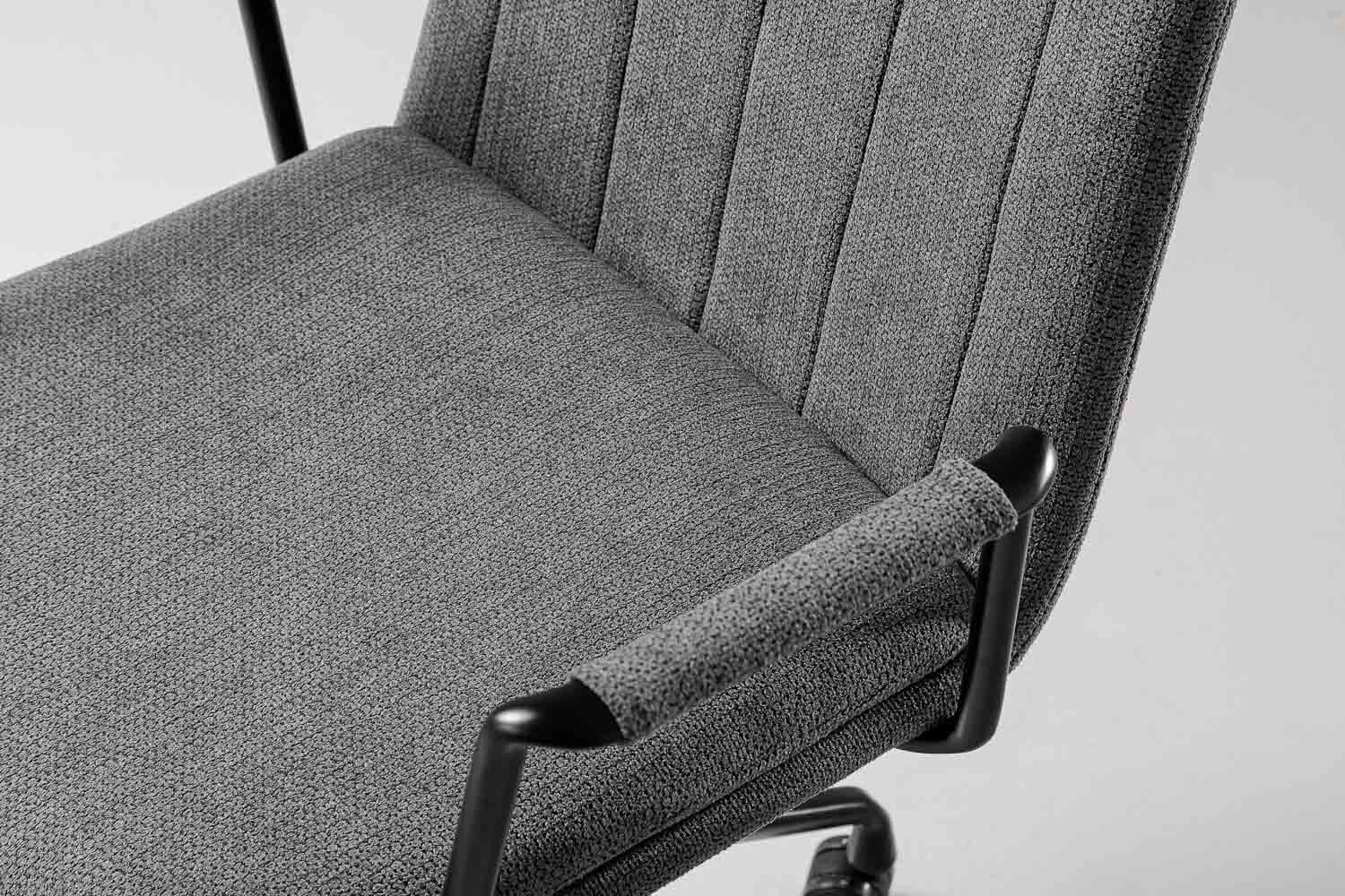 The Dursley Office Chair provides a comfortable and elegant solution to office seating. The chair features a textured charcoal fabric seat with visible stitching and upholstered armrests. It was designed to improve productivity and postural health during long work days.