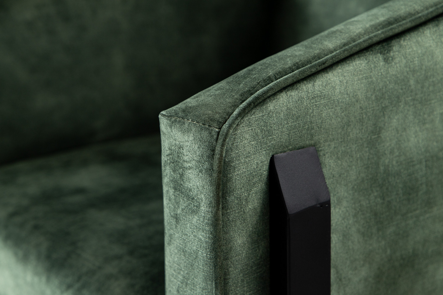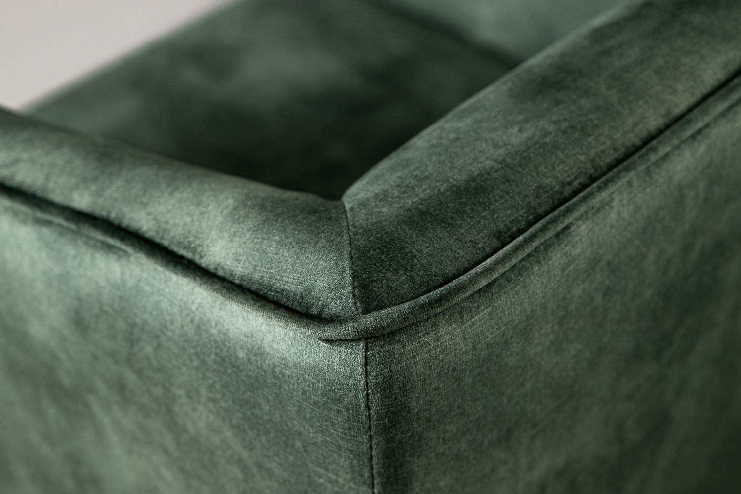 Attention to detail is evident in the meticulously tucked seam stitching, adding refinement to the chair’s luxurious appearance. The deep green tone pairs beautifully with warm woods, neutral palettes, or metallic accents, making it an adaptable piece for various decor styles.