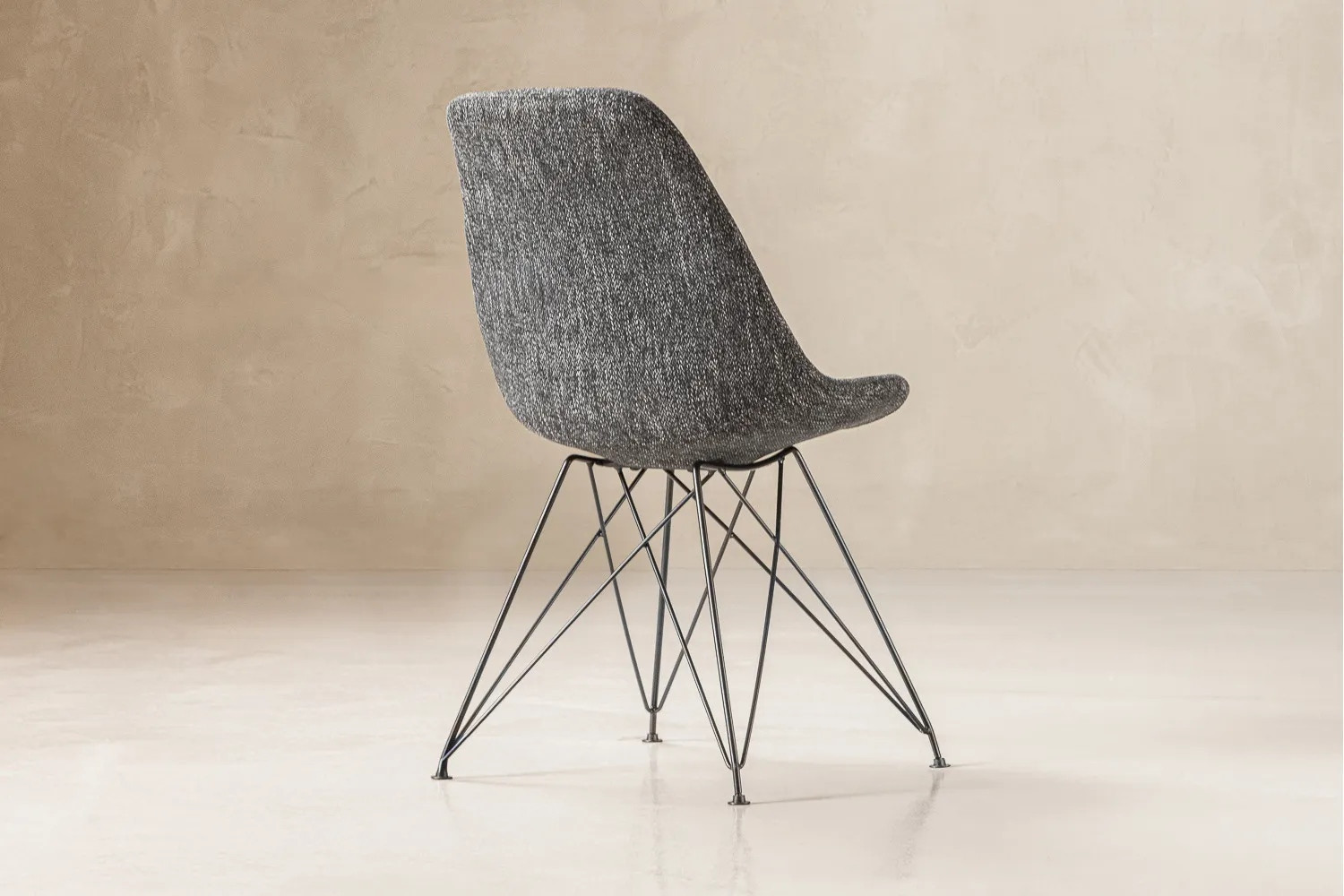 Sleek yet inviting, the Enzo Dining Chair pairs a contoured, fully upholstered seat in soft, charcoal fabric with eiffel-style mild steel legs. The sculpted shell, gentle lumbar curve and plush padding deliver easy comfort for long enjoyable dinners, while the airy base keeps the look light and contemporary. It’s a dining chair that offers comfort and unmistakable poise.