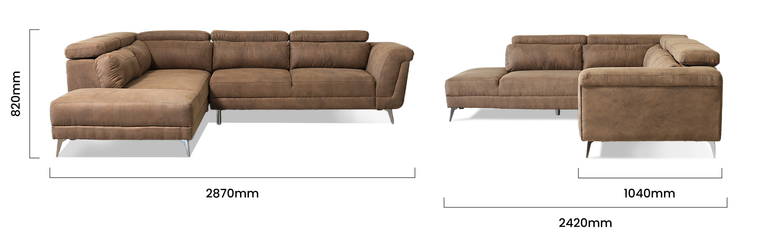 The Laurence Corner Couch is a modern, comfortable, and generously proportioned corner couch, complete with adjustable headrests. Ideal for hosting friends and family, the Laurence is upholstered in high-quality microfibre fabric for hours of luxurious seating.
