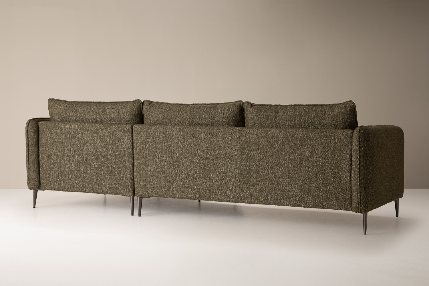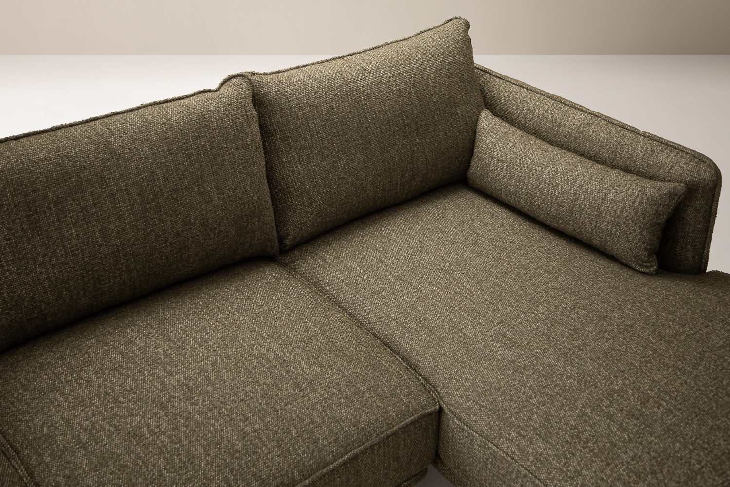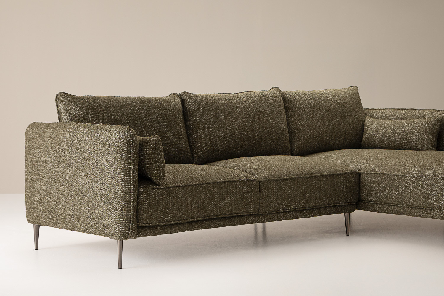 Inspire your interior with the mid-century modern elegance of the Ottavia L-Shape Couch. With its subtle green tones and vintage texture, this generously proportioned design makes an ideal statement piece, adding unparalleled style and luxurious comfort to your living space. Sink back into plush cushioning, put your feet up, and enjoy the Ottavia’s soft embrace.