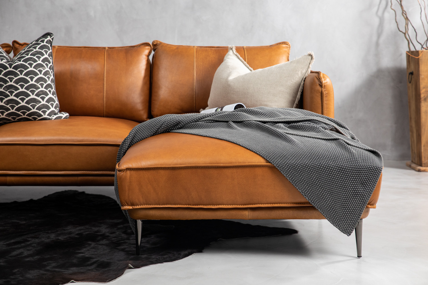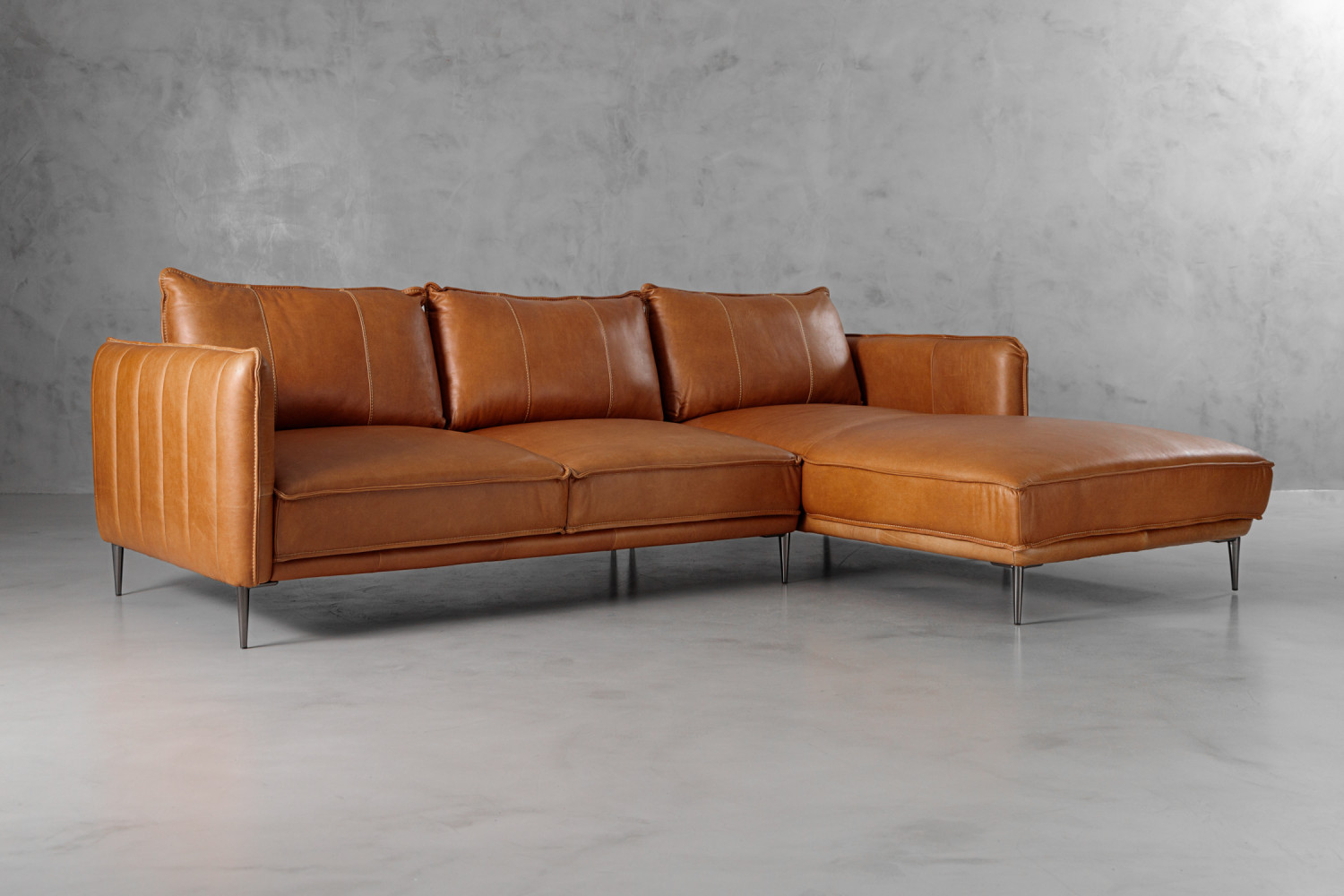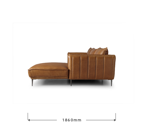 With its Mid-century modern inspired design, this sleek and well-proportioned L-shape emphasises easy comfort and clean lines for a simple yet elegant look. High quality leather upholstery adds a luxurious finish, with tapered metal feet perfectly contrasting and balancing the design overall.