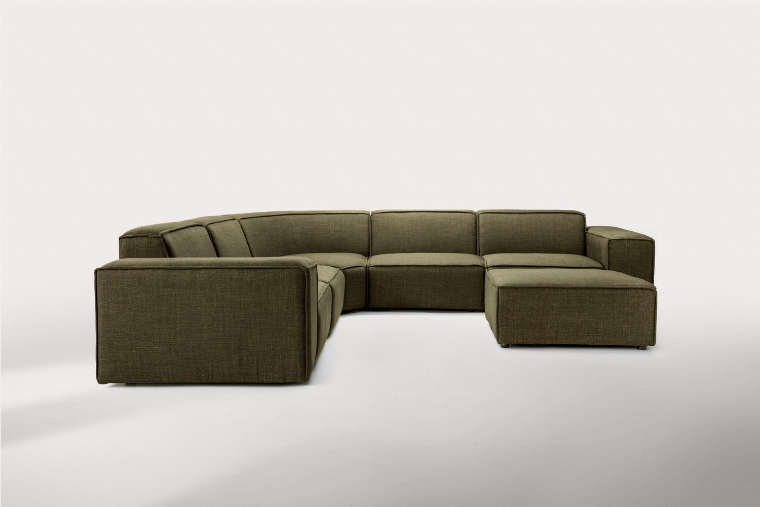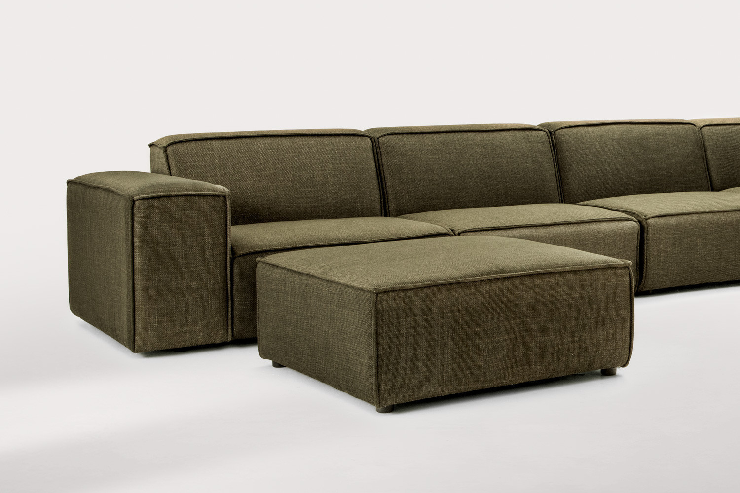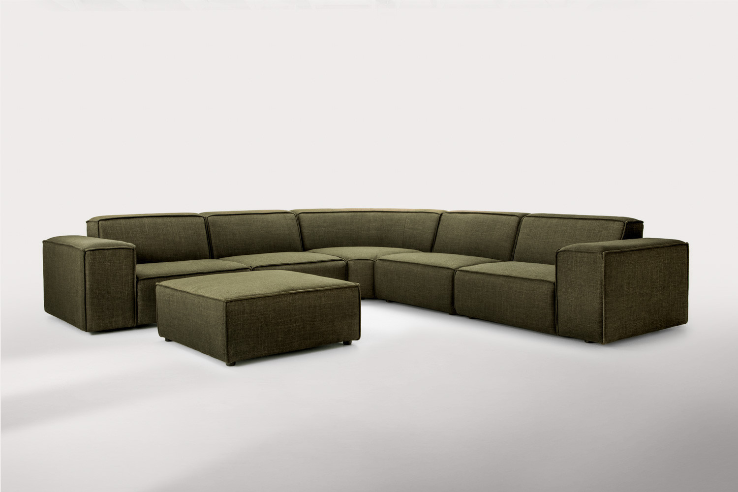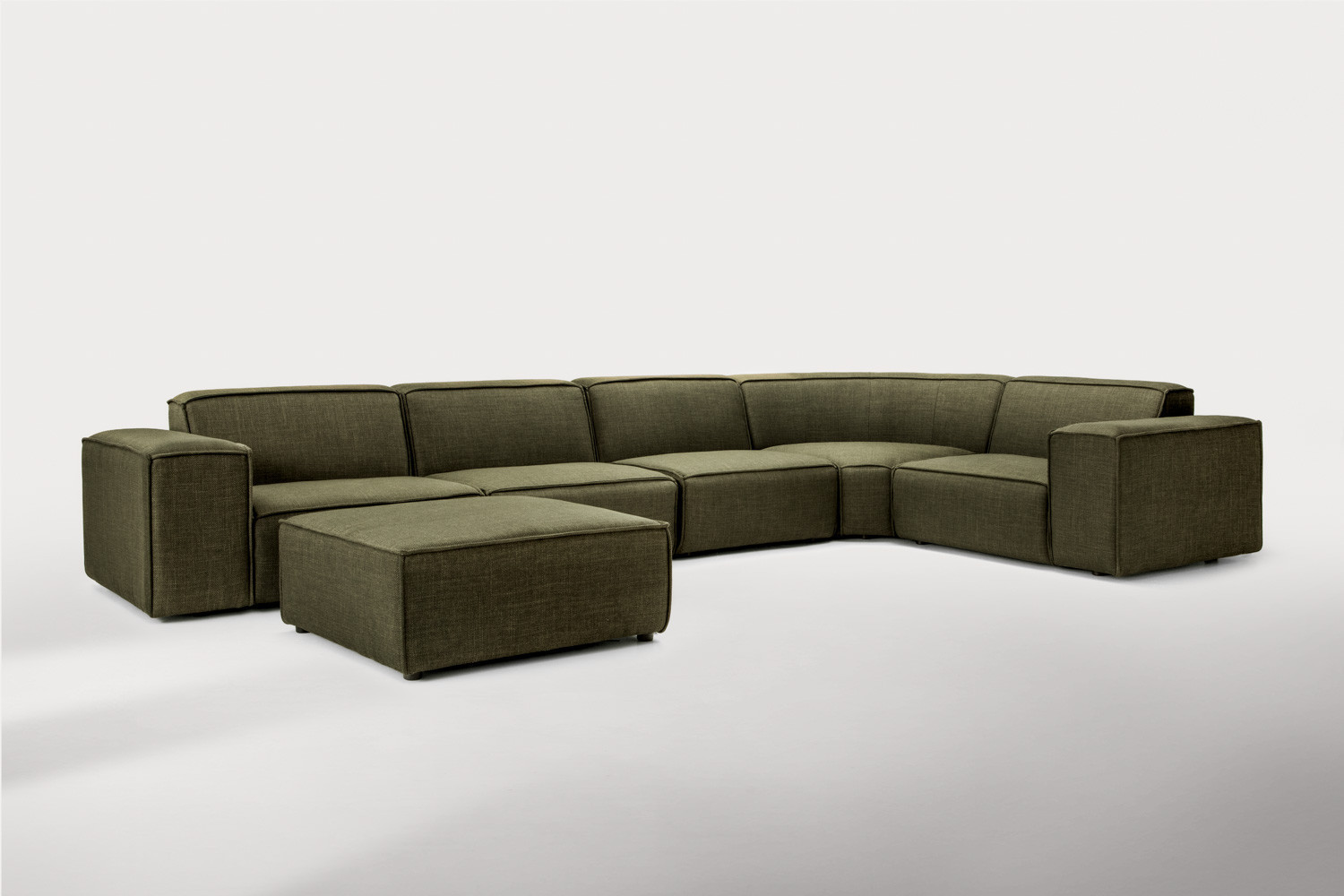 Designed to anchor large living areas, the Jagger Modular Grand Corner Couch with Ottoman combines bold lines with soft, supportive seating. Upholstered in high-quality fabric and crafted for modular adaptability, it can easily be rearranged to suit your lifestyle and living space. Details like the reversed stitching add tactile character and a touch of artisanal charm.