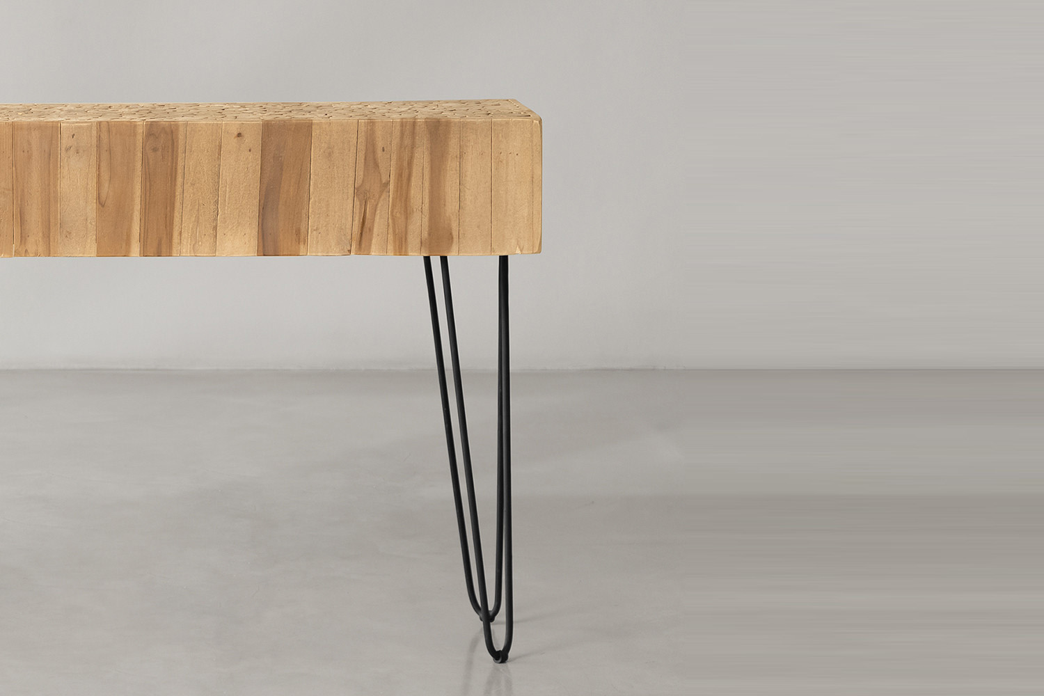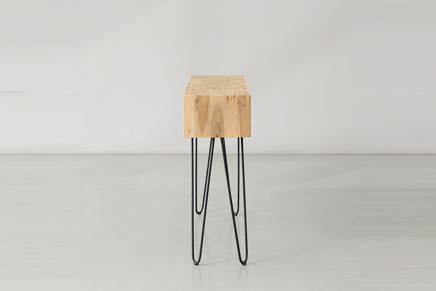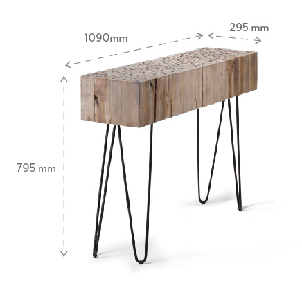 With its stylish design and unique character created by the contrast of earthy teak wood rounds and metal hairpin legs, this durable and sophisticated piece works as a versatile display table and accent piece for any setting.