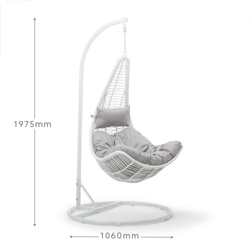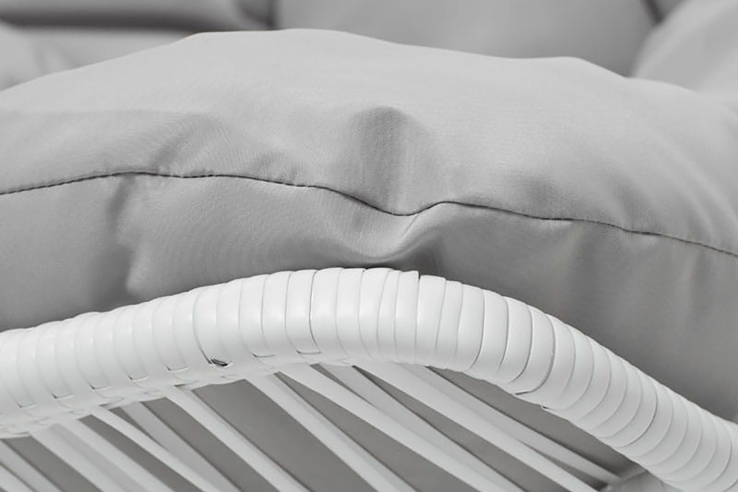 Turn your patio into your personal sanctuary and sink into the cradling comfort of the Lucia outdoor hanging chair. Designed for ultimate relaxation and durability, the contemporary style Lucia chair features weather & UV resistant PE rattan with comfortable polyester cushion included, set on a robust steel frame that guarantees stability. The light grey and white colour theme adds to the chair’s breezy, beach-inspired look to give you that relaxed holiday at home feeling.
