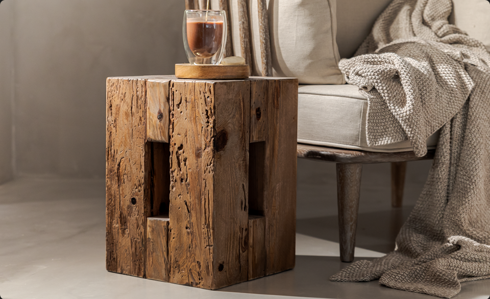 The Century Side Table introduces a warm tone and rustic finish to your room, providing both a versatile surface and extra seating.