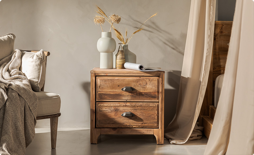 Complete your bedroom space with this bedside table, featuring two spacious draws and a beautiful natural finish.