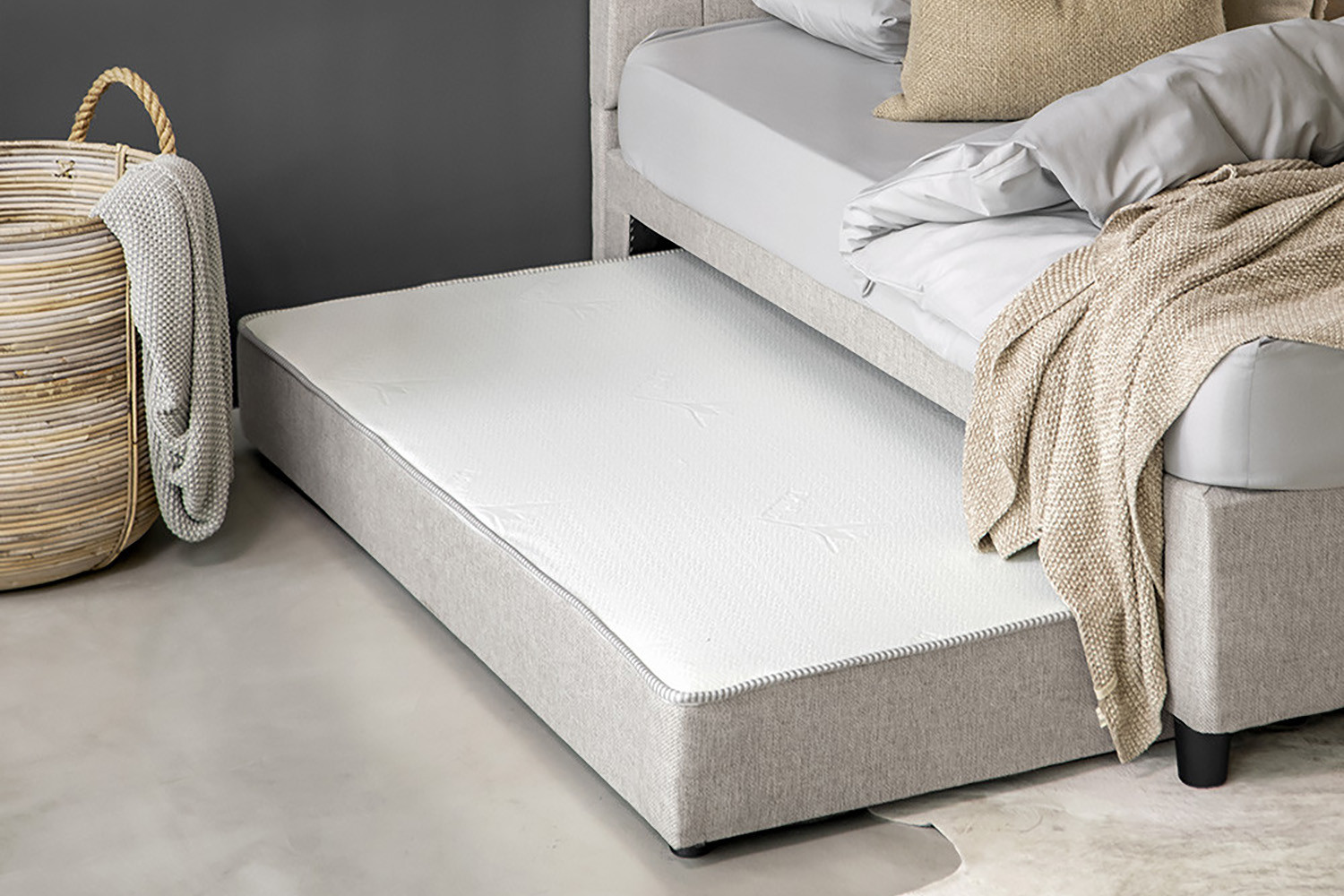 The set features a sturdy platform base with a second pull-out bed that has a built-in foam mattress just add bedding and it’s good to go! Upholstered in high-quality polyester for low maintenance and easy cleaning, this bed set will see your family through the seasons.