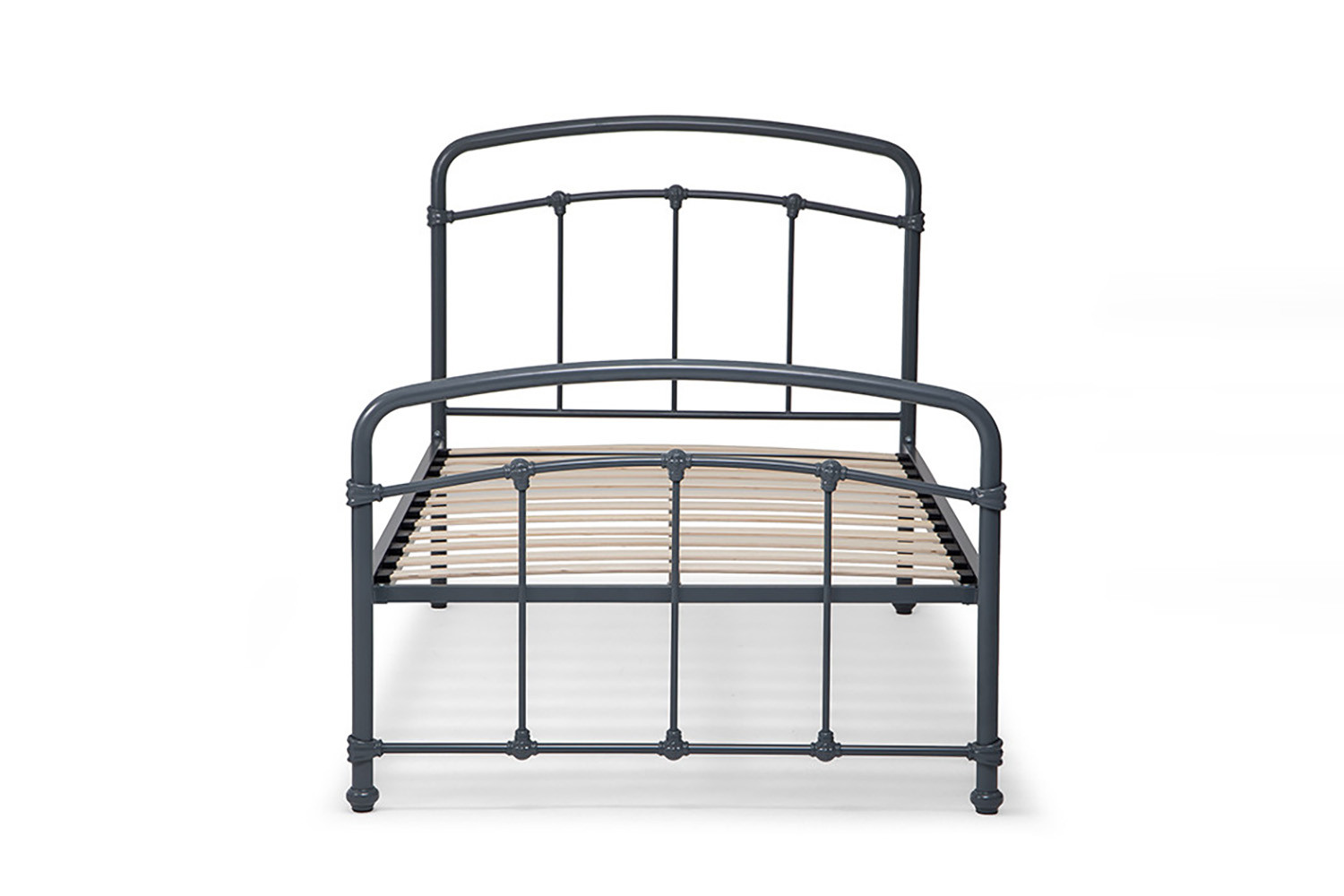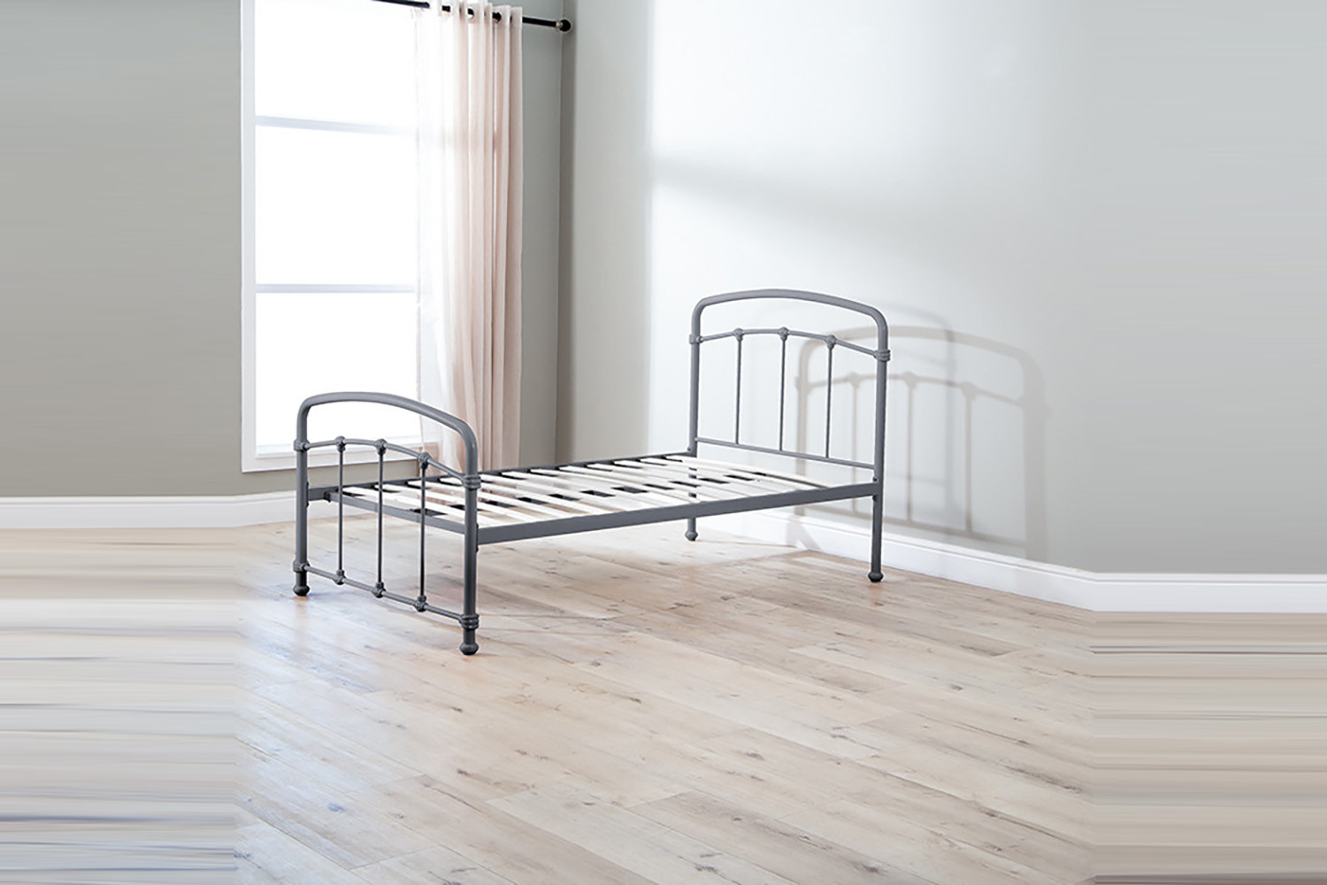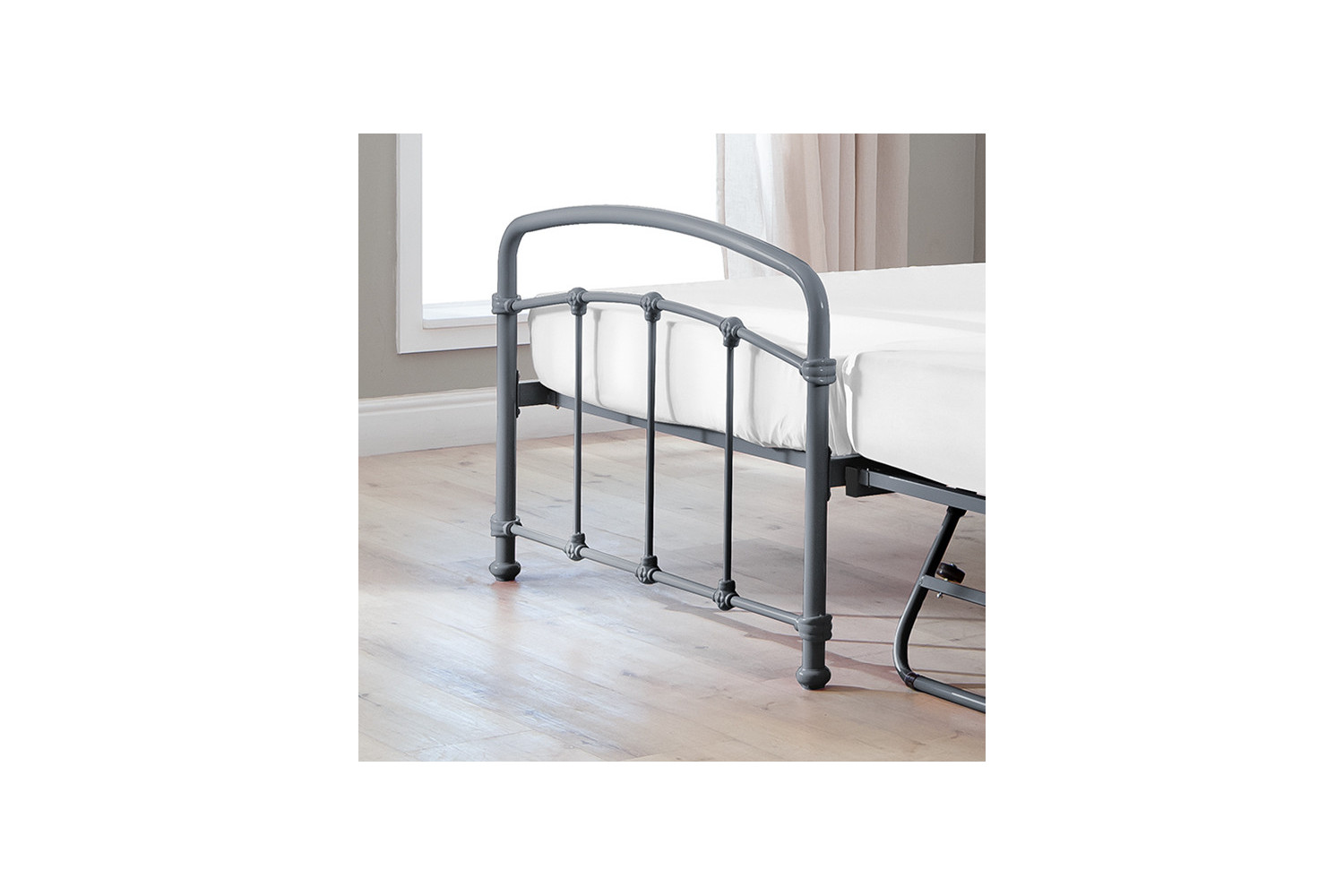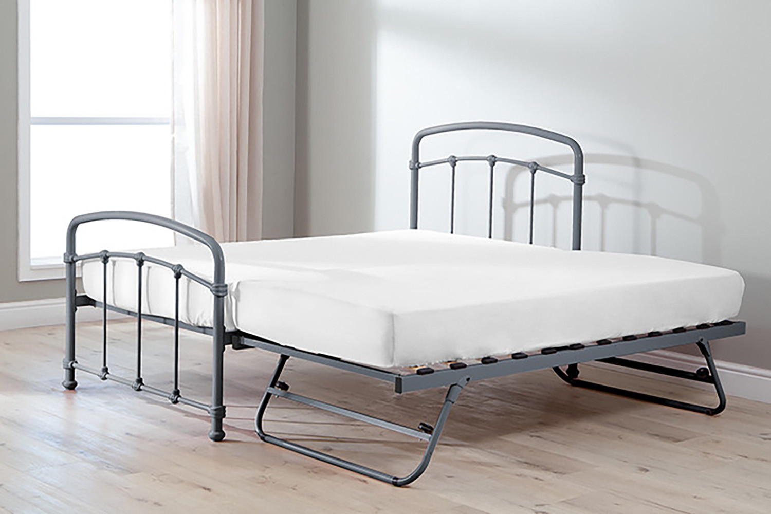 The Larissa Bed, constructed from durable powder-coated steel and featuring sprung slats that provide ideal support for all foam mattress types, offers quality and versatility with the option to add a lower trundle bed to convert to a larger bed or two standalone locations.