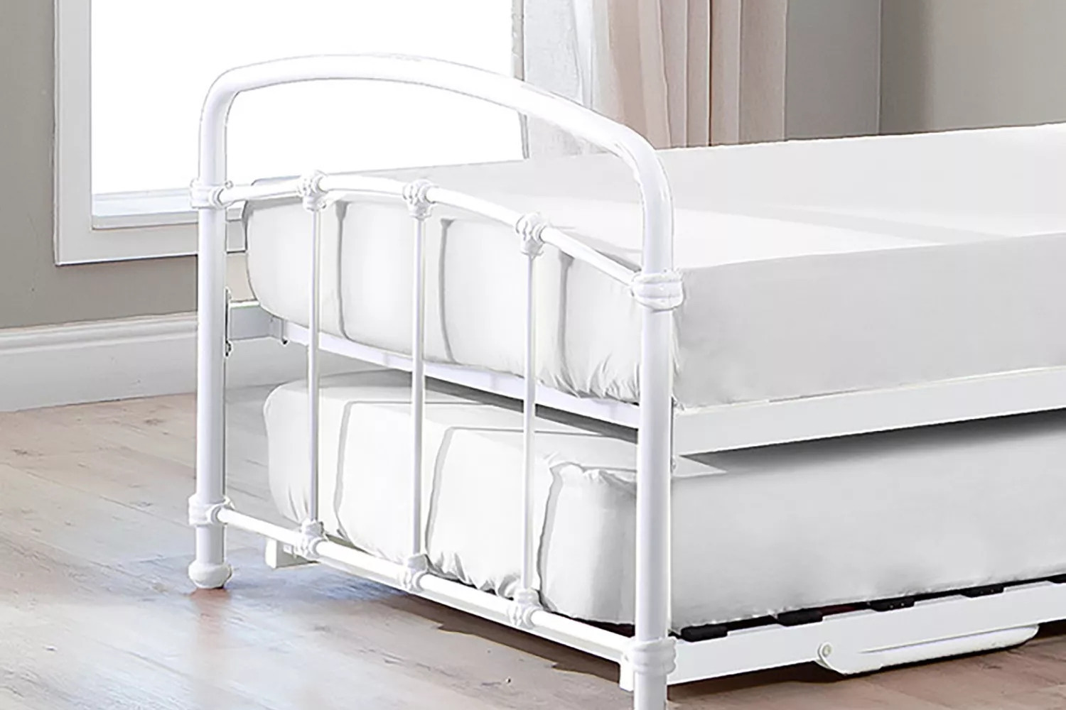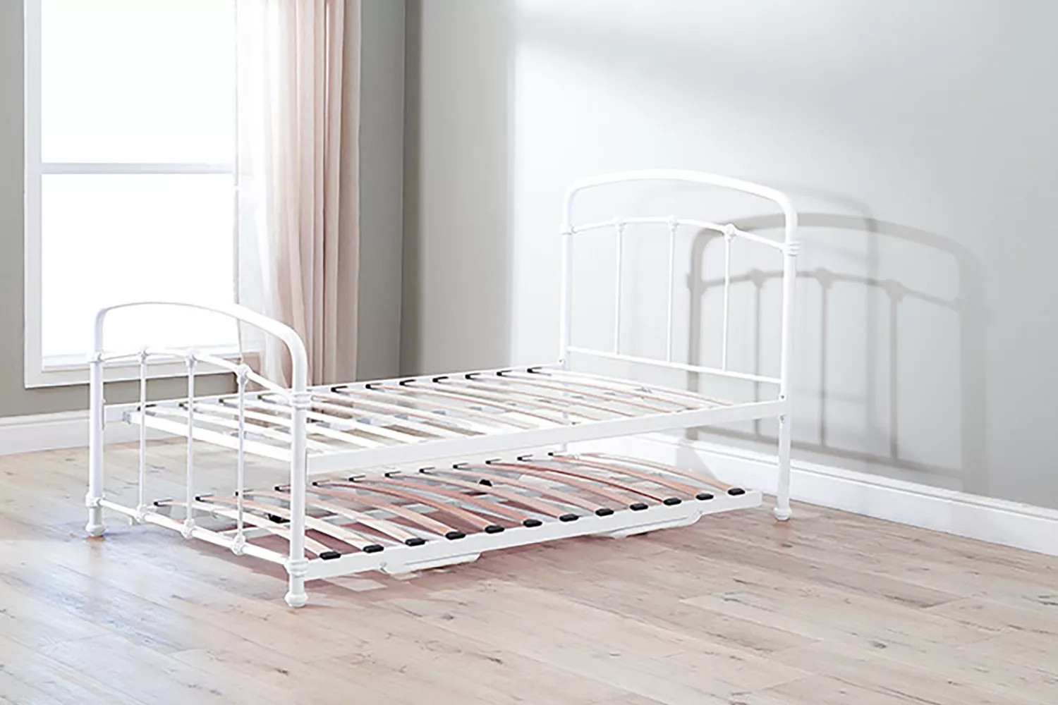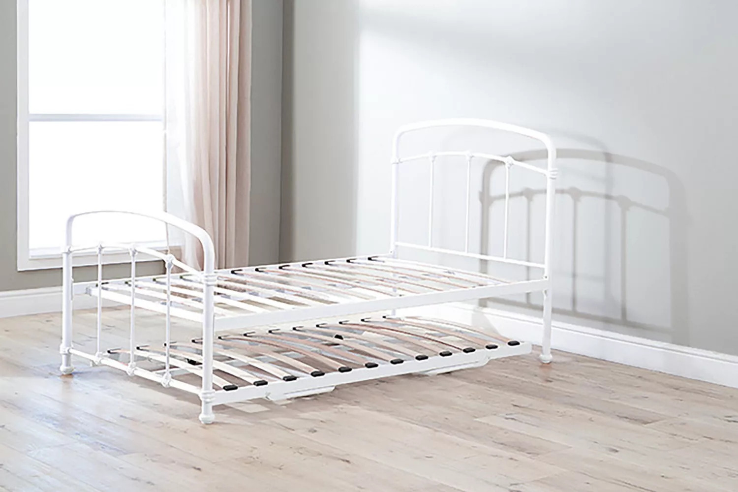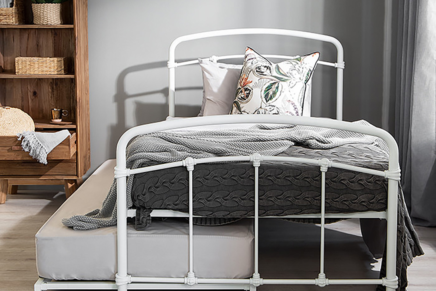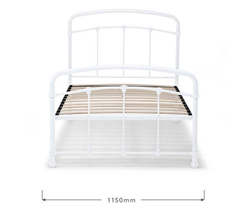 The Larissa Bed, constructed from durable powder-coated steel and featuring sprung slats that provide ideal support for all foam mattress types, offers quality and versatility with the option to add a lower trundle bed to convert to a larger bed or two standalone locations.