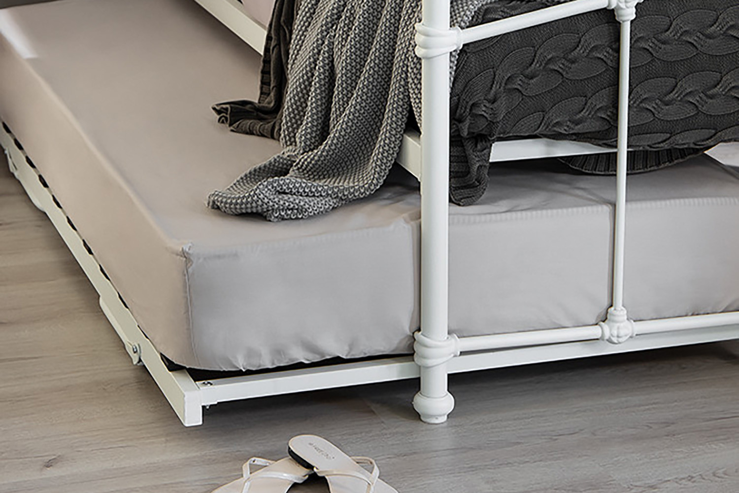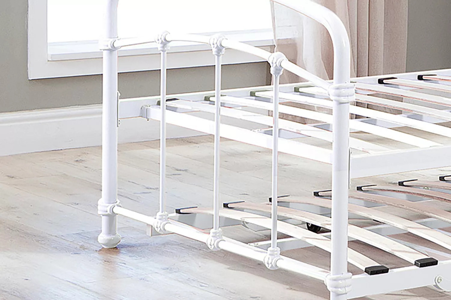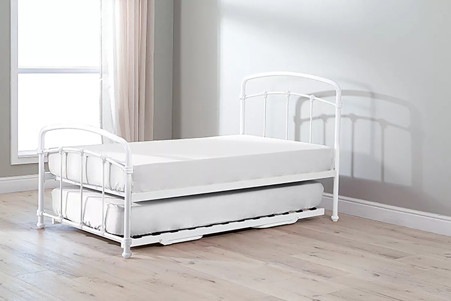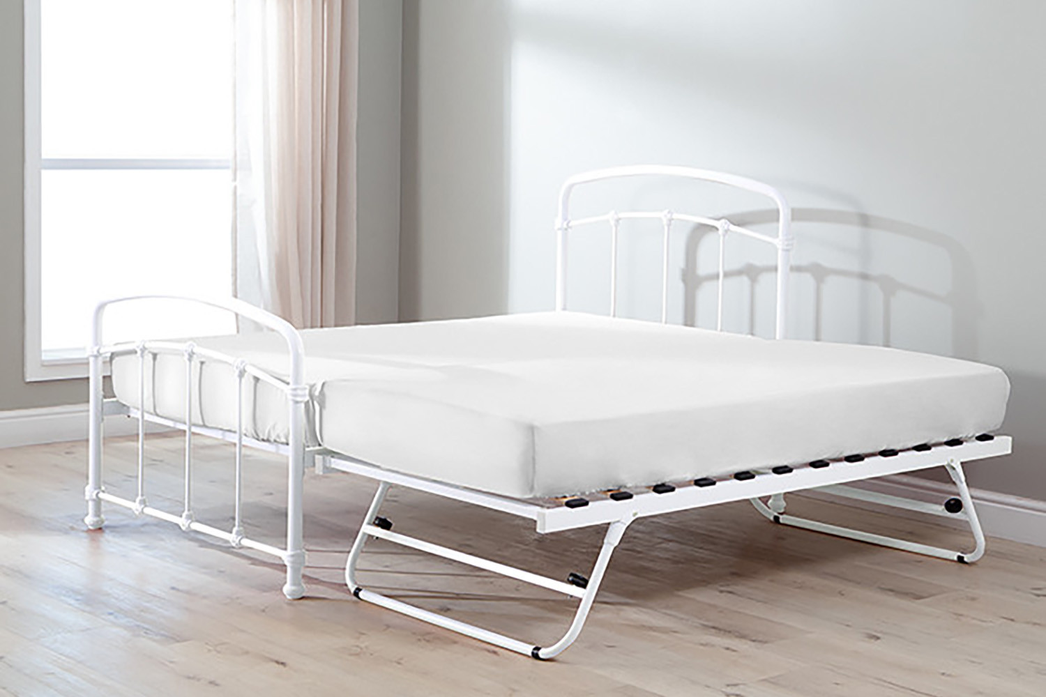 The Larissa Bed, constructed from durable powder-coated steel and featuring sprung slats that provide ideal support for all foam mattress types, offers quality and versatility with the option to add a lower trundle bed to convert to a larger bed or two standalone locations.