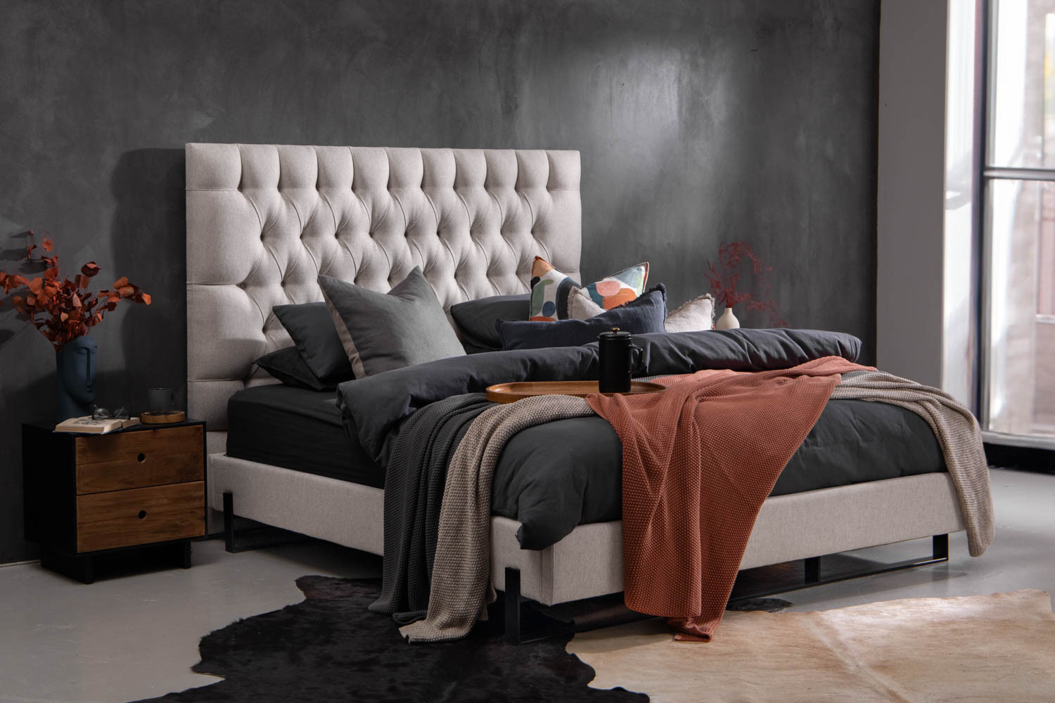 • Upholstered bed base with aesthetic mild steel legs
