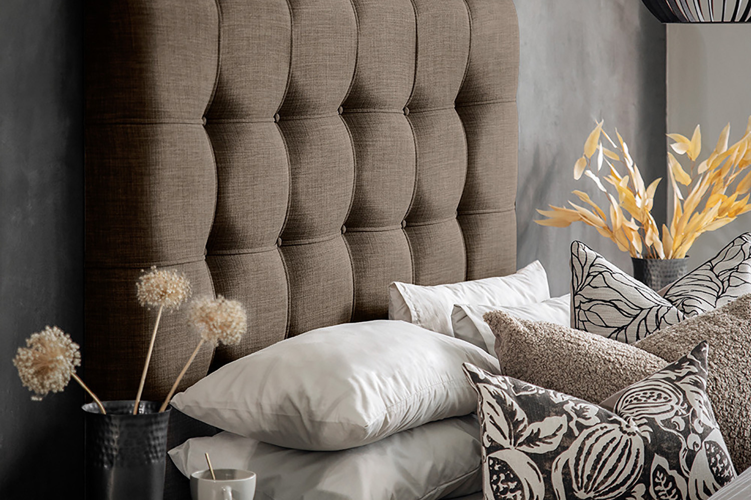 The Ariella headboard features a large grid tufted design with button detailing for a stylish contemporary look. Generously padded and well proportioned, this headboard offers cosy and comfortable support when you need a couple of peaceful hours to work or read in bed.