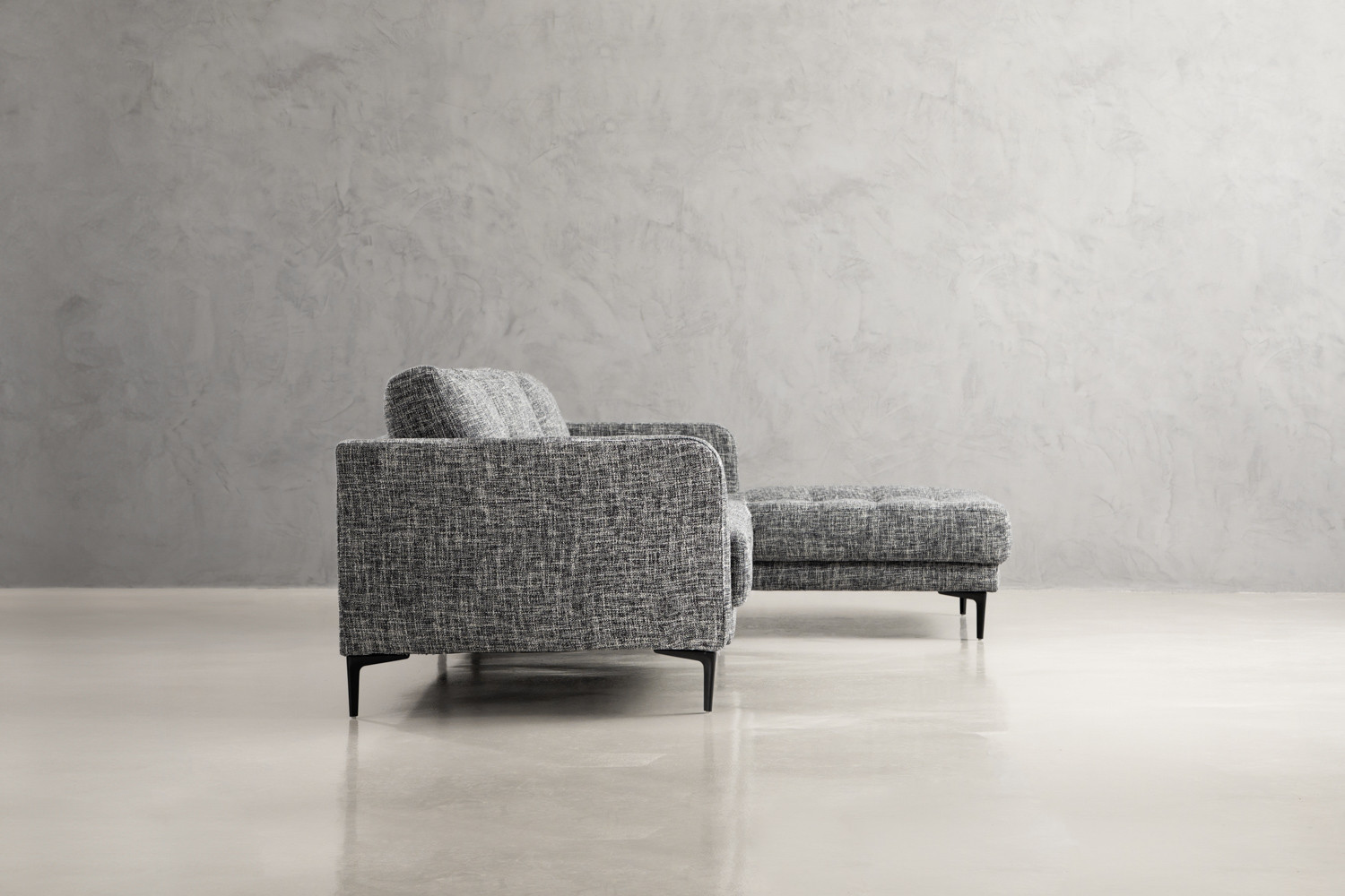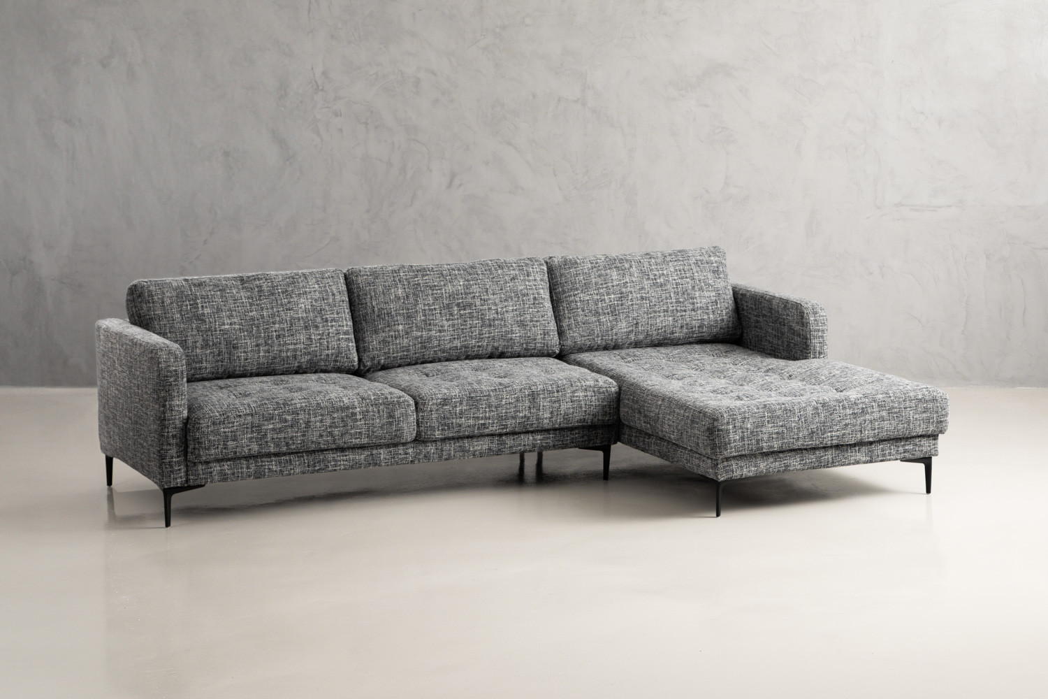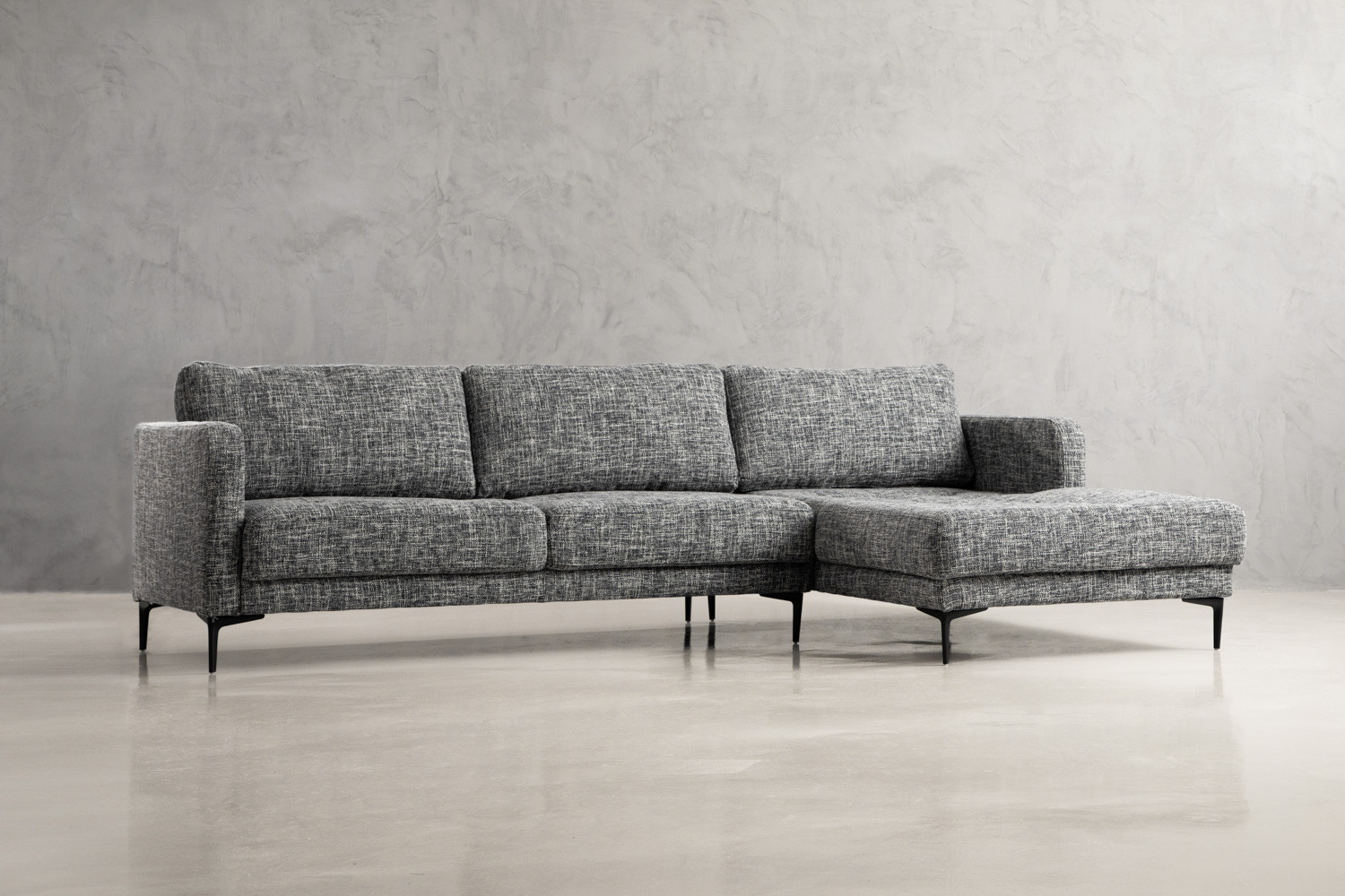 Add a rich sense of comfort to your living space with the Hayden L-Shape Couch. Upholstered in a textured fabric with charcoal tones, this opulent unit features an elegant modern design with distinctive stitching. The blind tufted seat cushions and tapered steel legs give the Hayden a unique character and charm.