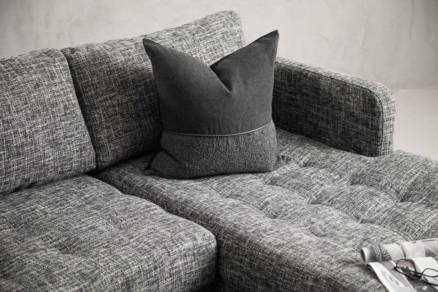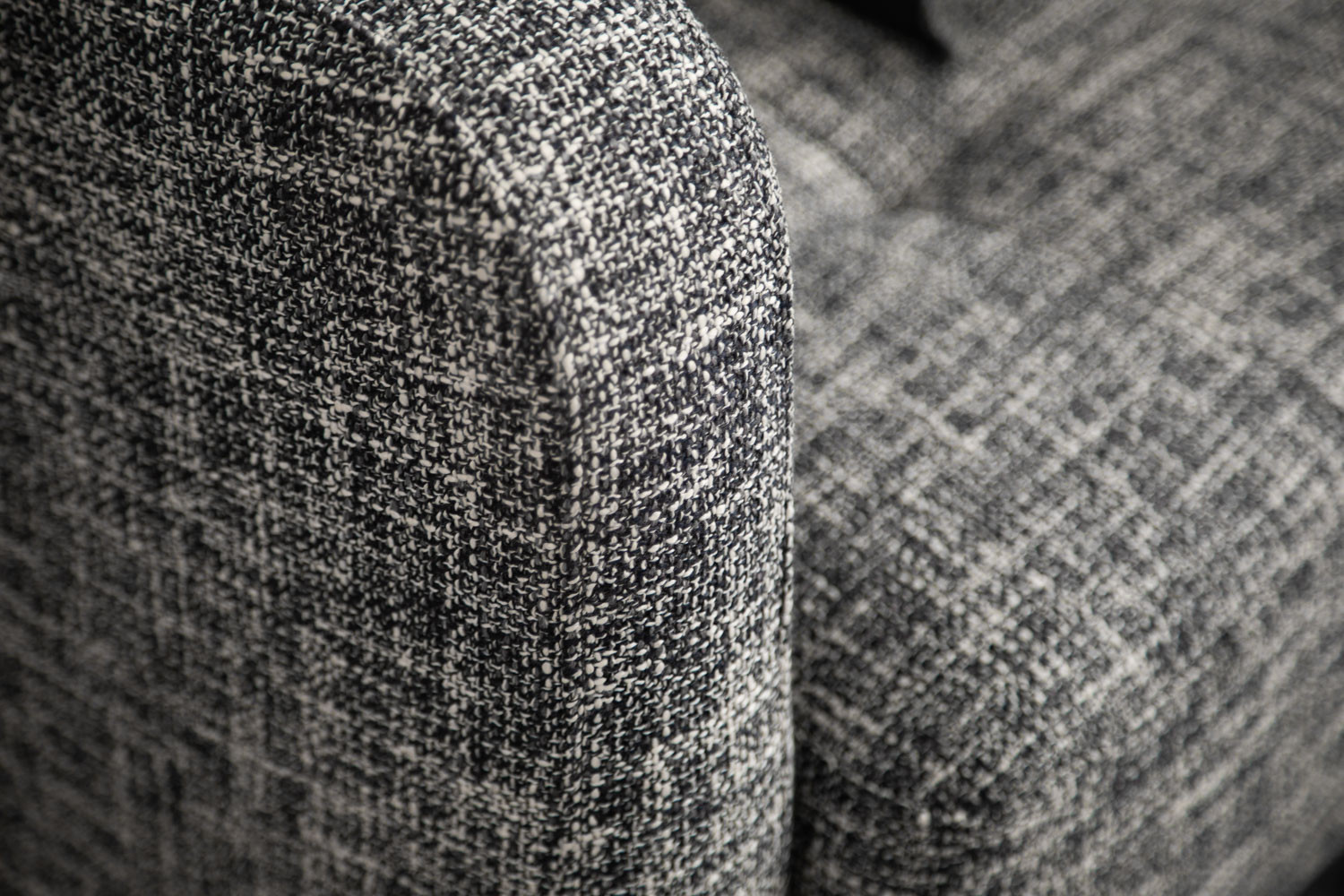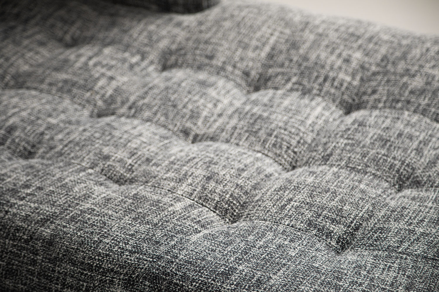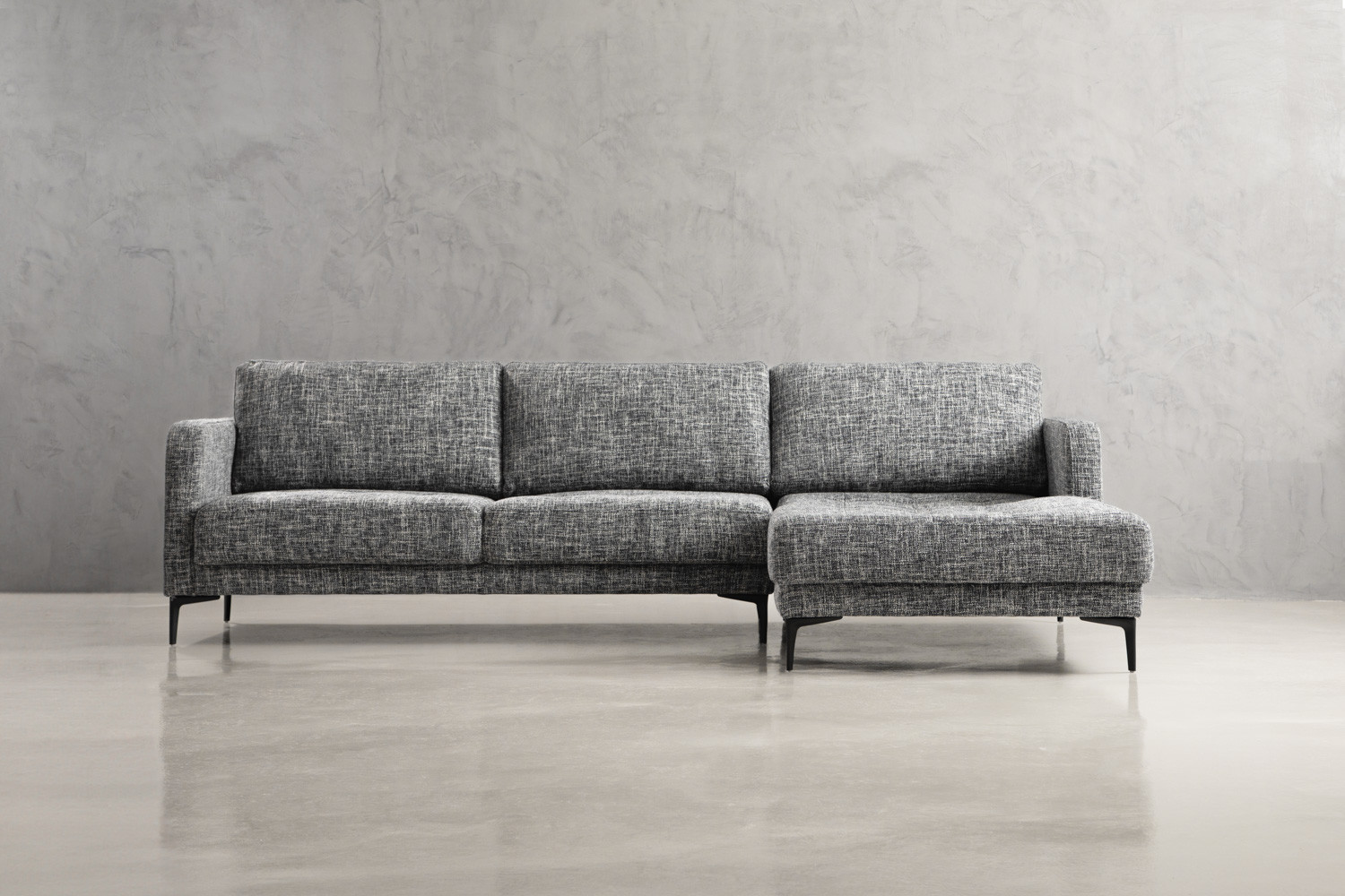 Add a rich sense of comfort to your living space with the Hayden L-Shape Couch. Upholstered in a textured fabric with charcoal tones, this opulent unit features an elegant modern design with distinctive stitching. The blind tufted seat cushions and tapered steel legs give the Hayden a unique character and charm.