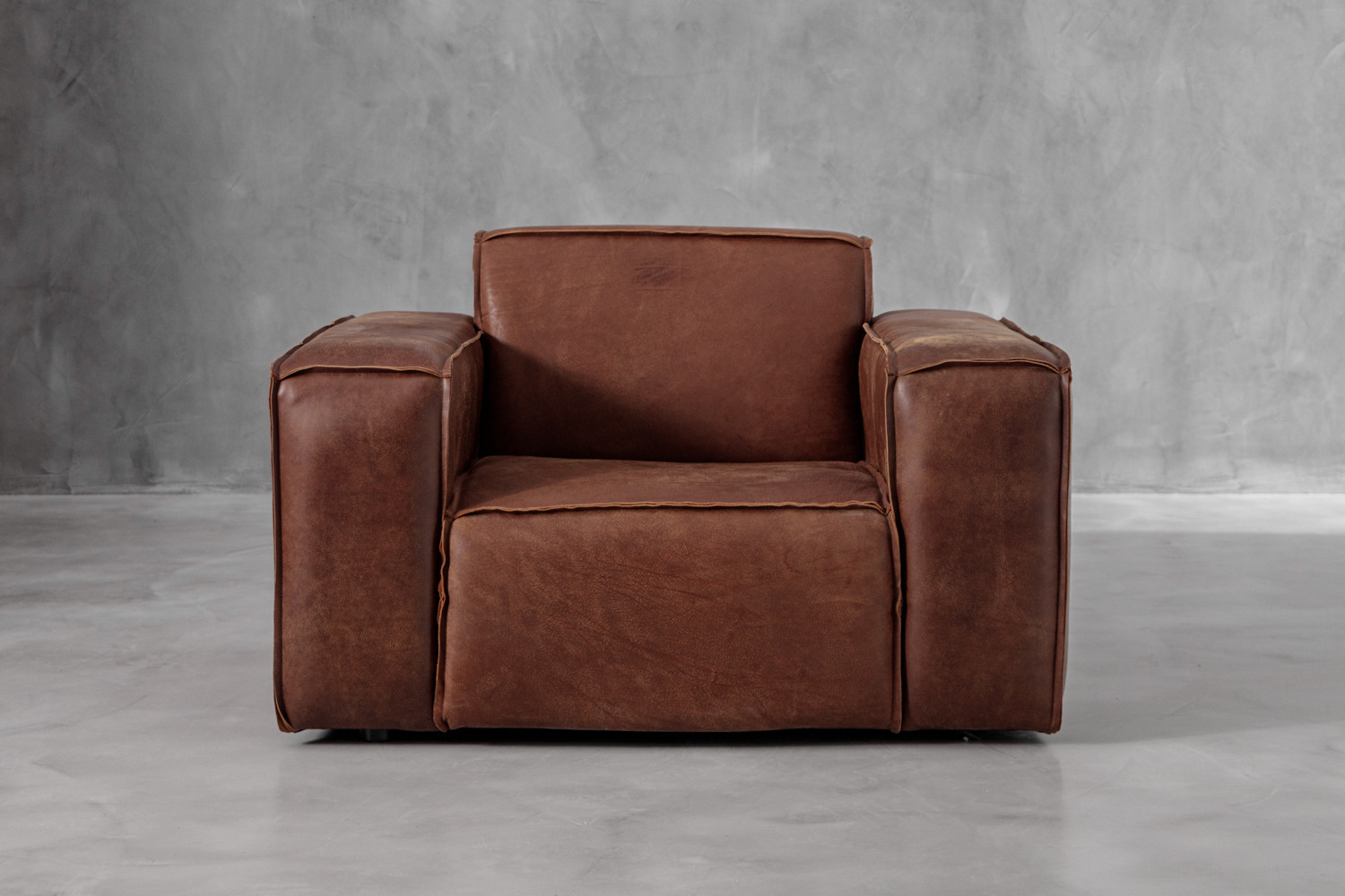 The Jagger Armchair boasts a bold contemporary design with a square-like silhouette, keeping the design simple but striking. The Jagger is upholstered with luxurious Nubuck genuine leather, finished with reversed stitched seams to keep a natural raw look with a warm feel. This armchair is the ideal furniture piece for any contemporary setting.