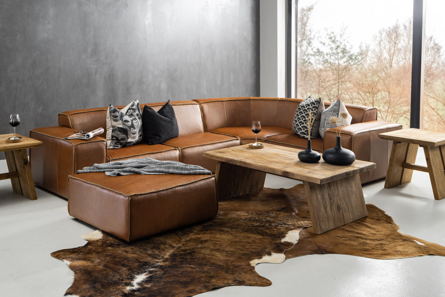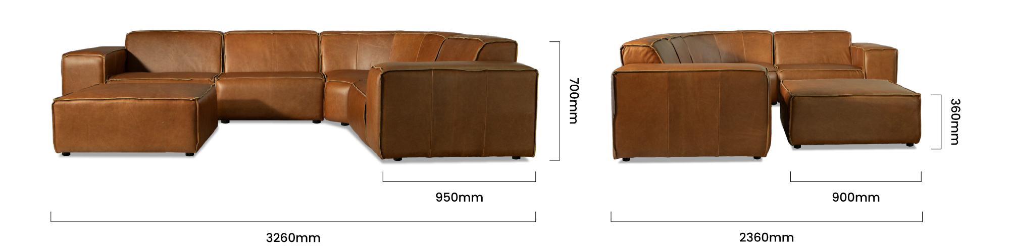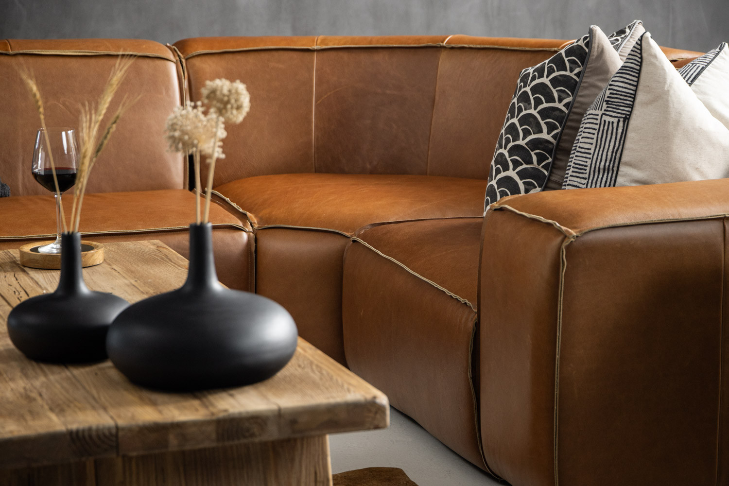 The Jagger Leather Modular Corner Couch With Ottoman boasts a bold contemporary design with a square-like silhouette, keeping the design simple but striking. With plenty of style and space, this modular couch is upholstered with luxurious genuine full grain leather, finished with reversed stitched seams to keep a natural raw look with a warm feel.