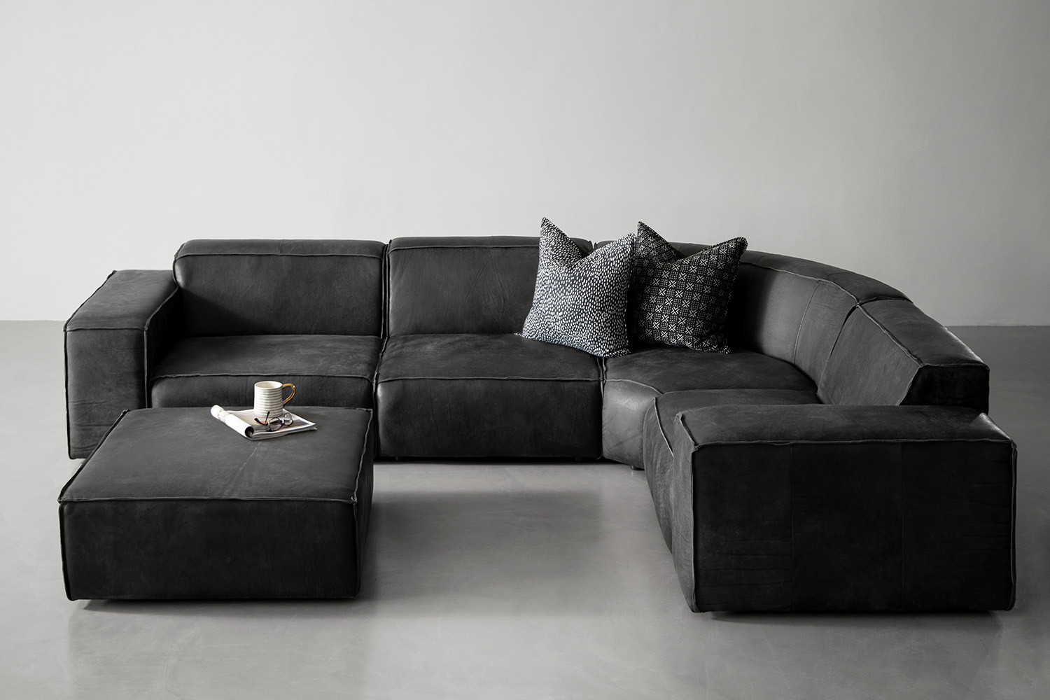 The Jagger Leather Modular Corner Couch With Ottoman boasts a bold contemporary design with a square-like silhouette, keeping the design simple but striking. With plenty of style and space this modular couch is upholstered with luxurious Nubuck leather, finished with reversed stitched seams to keep a natural raw look with a warm feel.