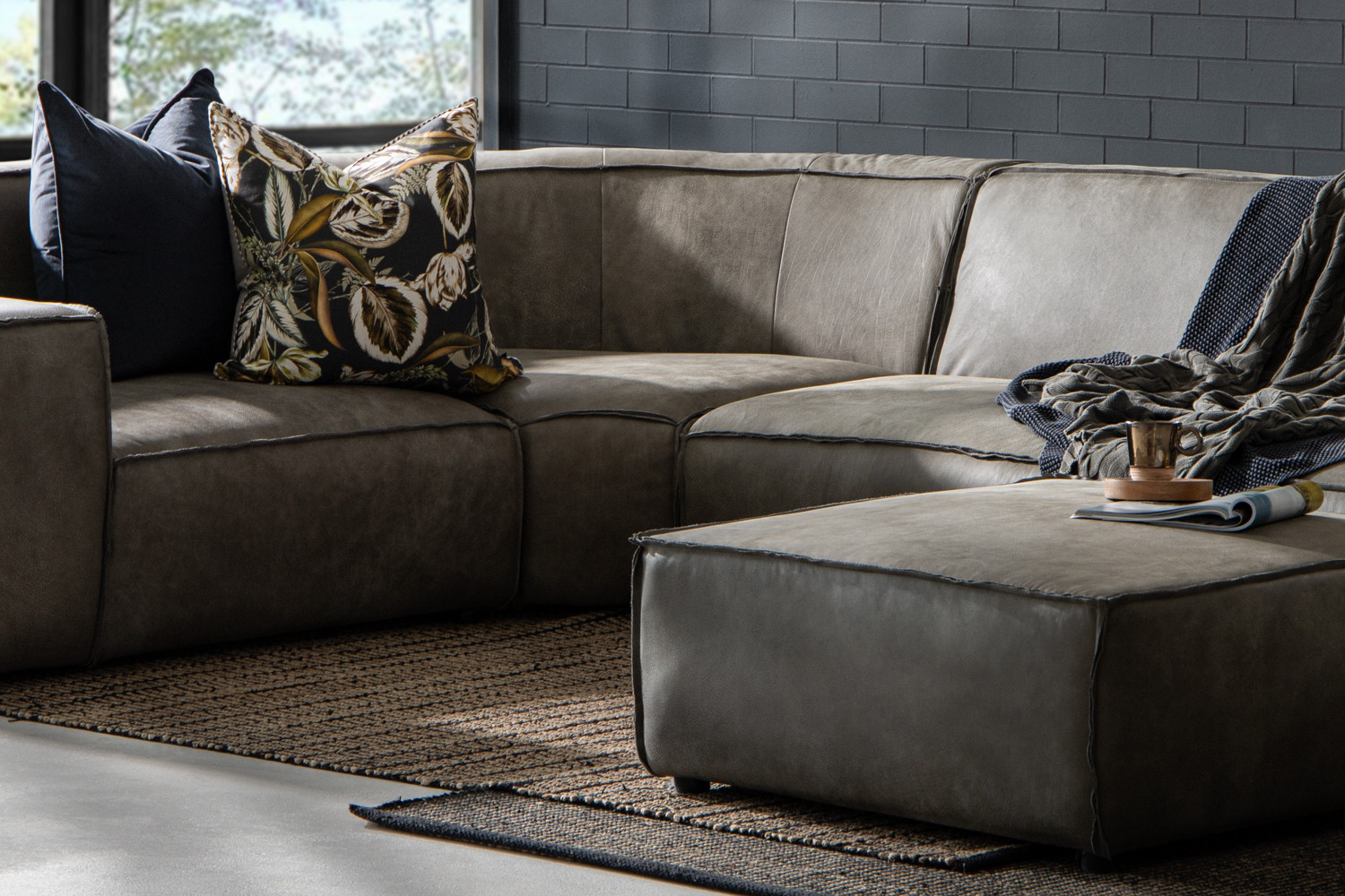 The Jagger Leather Modular Corner Couch With Ottoman boasts a bold contemporary design with a square-like silhouette, keeping the design simple but striking. With plenty of style and space this modular couch is upholstered with luxurious Nubuck leather, finished with reversed stitched seams to keep a natural raw look with a warm feel.