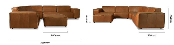 The Jagger Leather Modular Grand Corner Couch with Ottoman boasts a bold contemporary design with a square-like silhouette, keeping the design simple but striking. With plenty of style and space, this modular couch is upholstered with luxurious genuine full grain leather, finished with reversed stitched seams to keep a natural raw look with a warm feel.