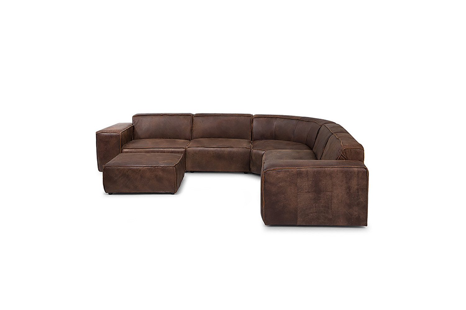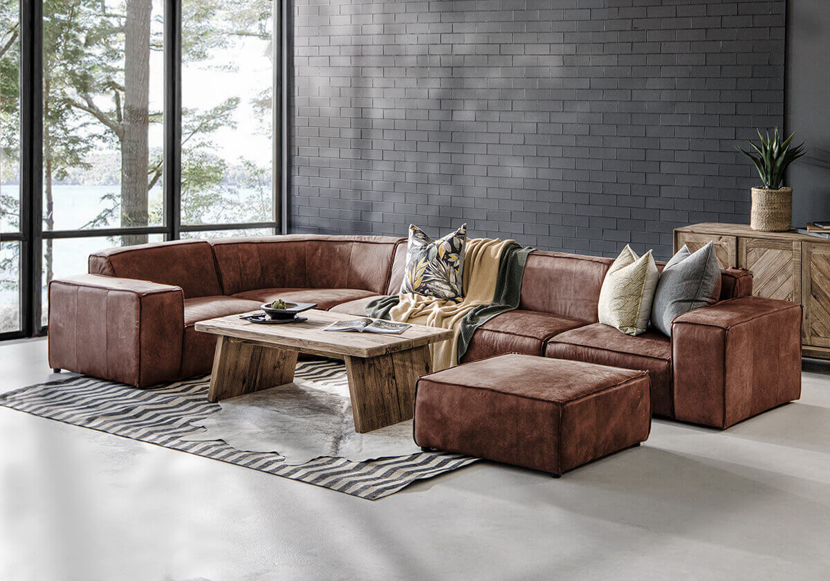 The Jagger Leather Modular Grand Corner Couch with Ottoman boasts a bold contemporary design with a square-like silhouette, keeping the design simple but striking. With plenty of style and space this modular couch is upholstered with luxurious Nubuck leather, finished with reversed stitched seams to keep a natural raw look with a warm feel.