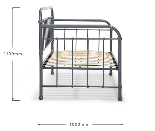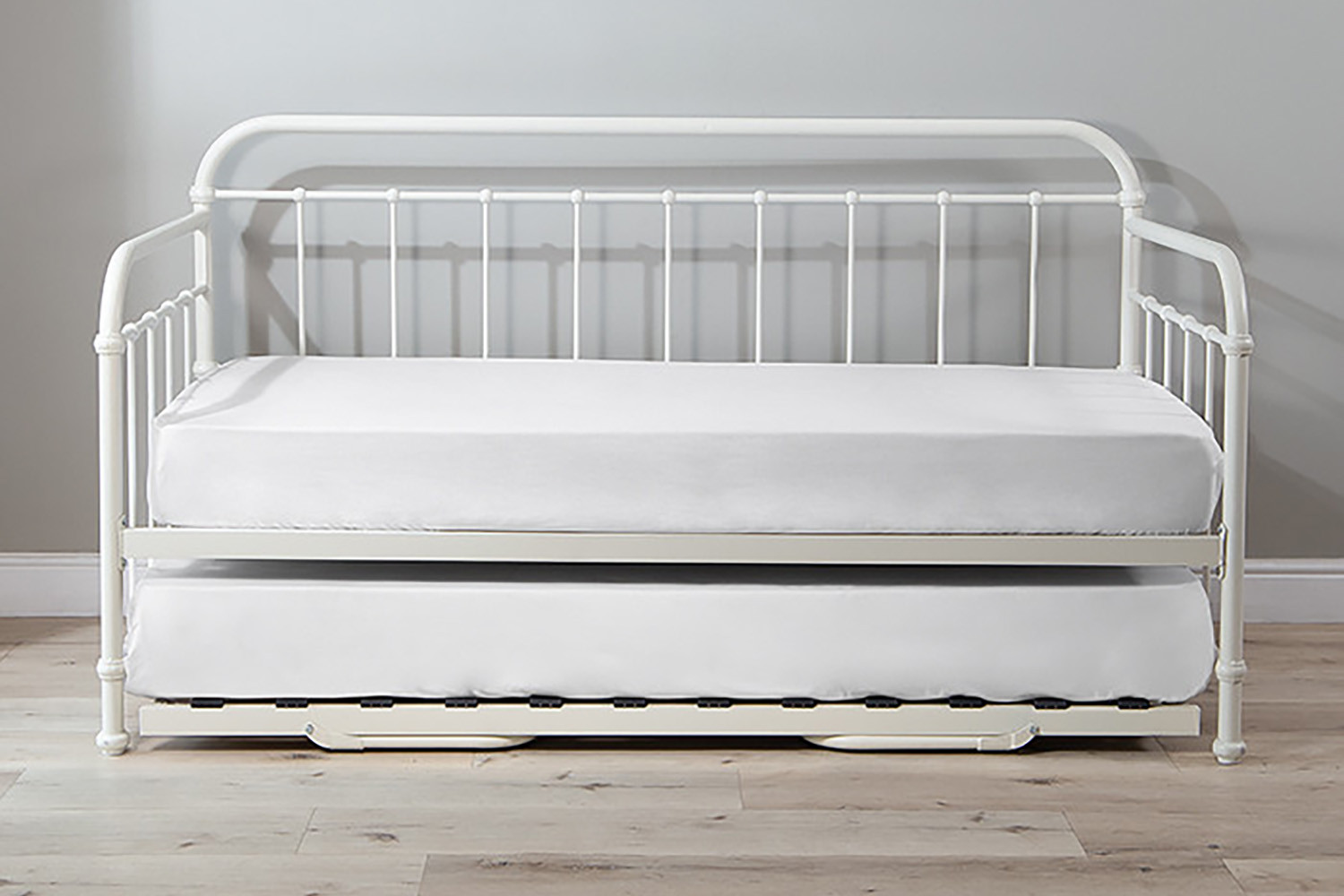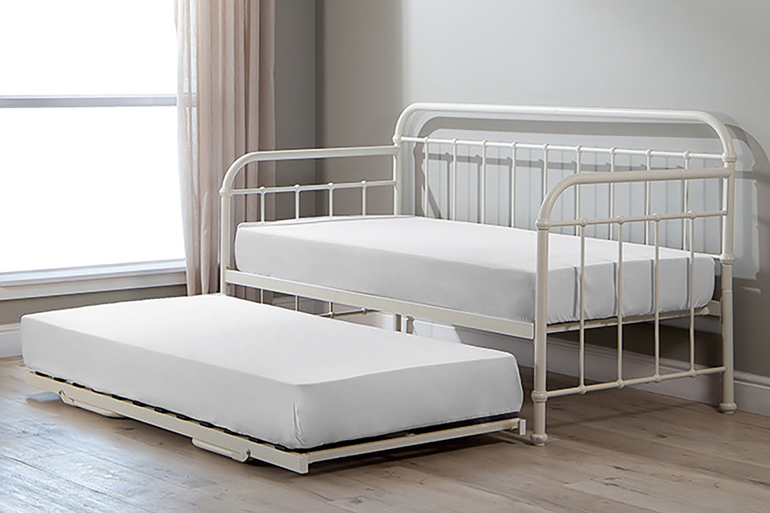 The Eralena Daybed, constructed from durable powder-coated steel and featuring sprung slats that provide ideal support for all foam mattress types, offers quality and versatility with the option to add a lower trundle bed to convert from a Single to a King size bed.