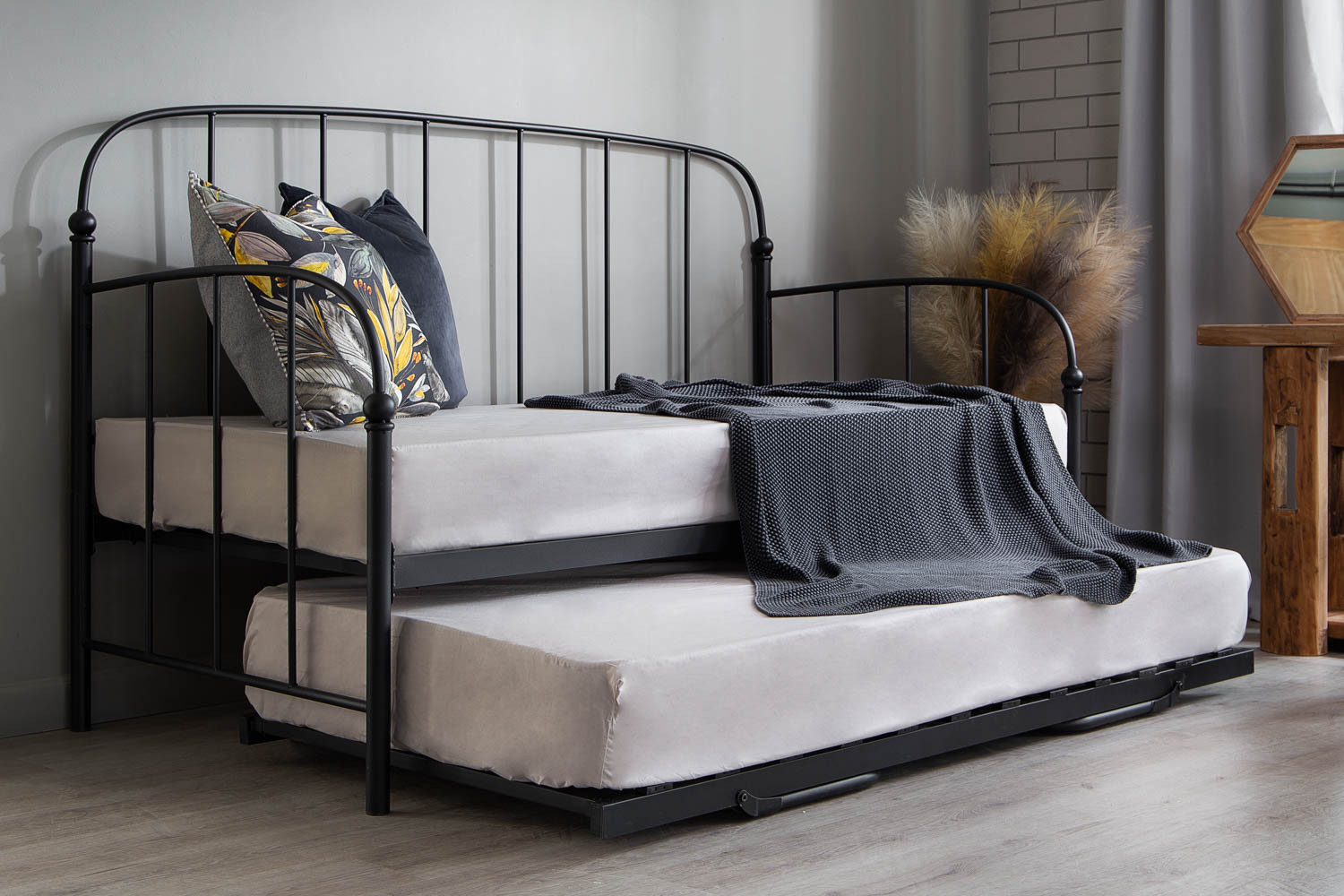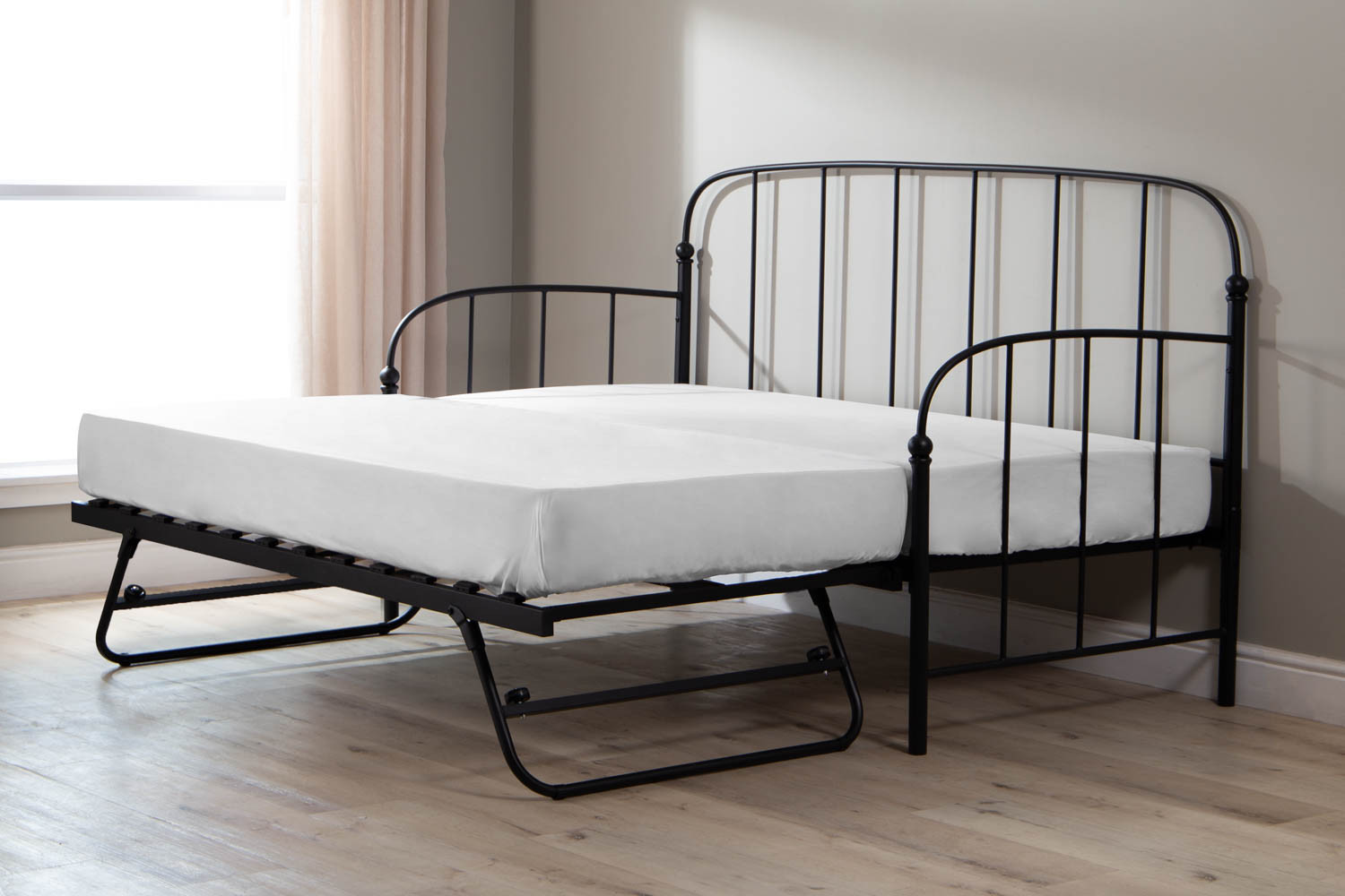 The Helena Metal Daybed Combo, constructed from durable powder-coated steel and featuring sprung slats that provide ideal support for all foam mattress types, offers quality and versatility with the option to add a lower trundle bed to convert from a Single to a King size bed.