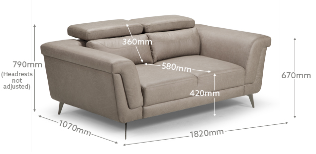 Two Seater: 1820mm (L) x 1070mm (W) x 790mm (H) (Headrests not adjusted) | Seat Height: 420mm | Seat Depth: 580mm