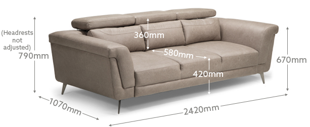 Three Seater: 2420mm (L) x 1070mm (W) x 790mm (H) (Headrests not adjusted) |Seat Height: 420mm | Seat Depth: 580mm