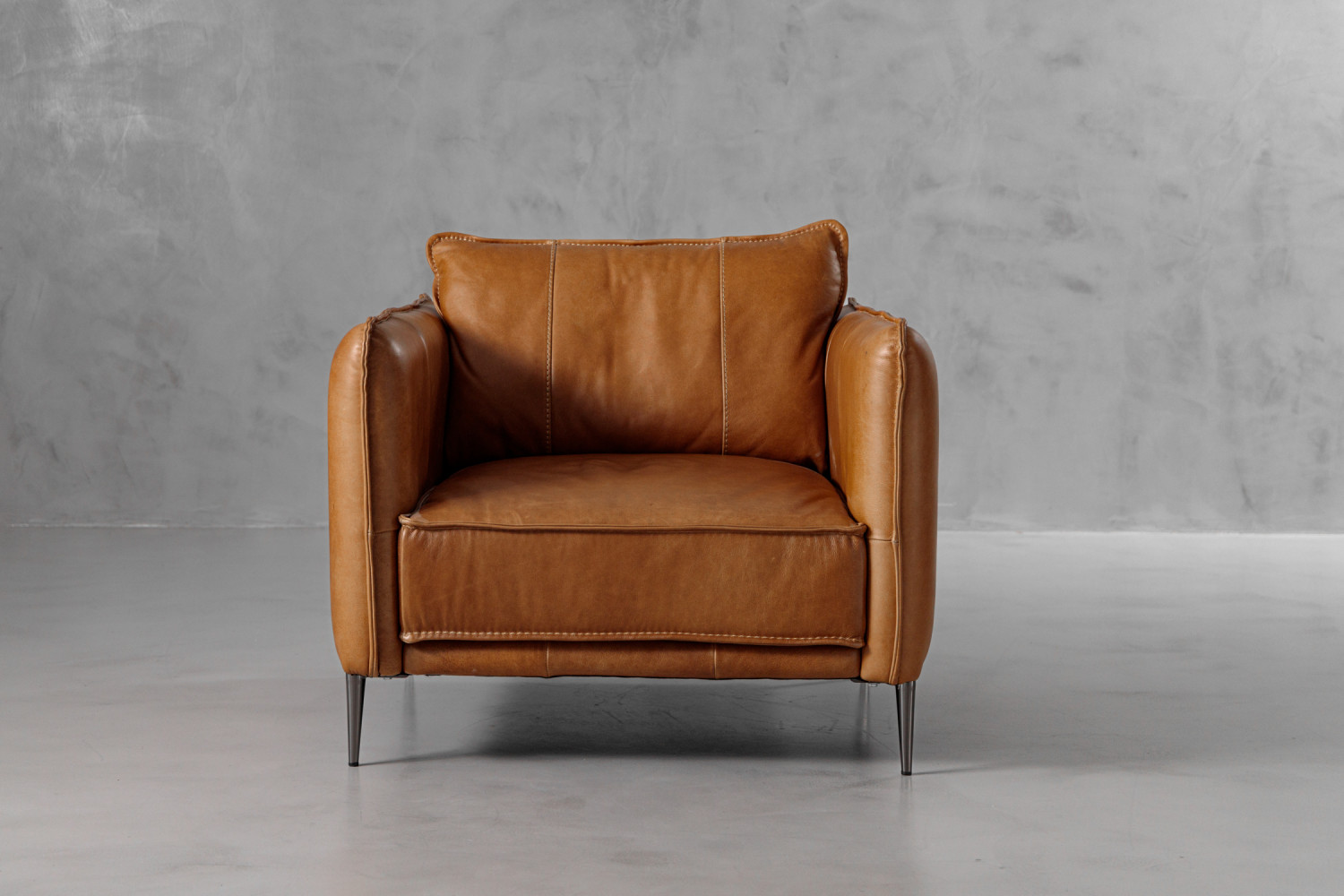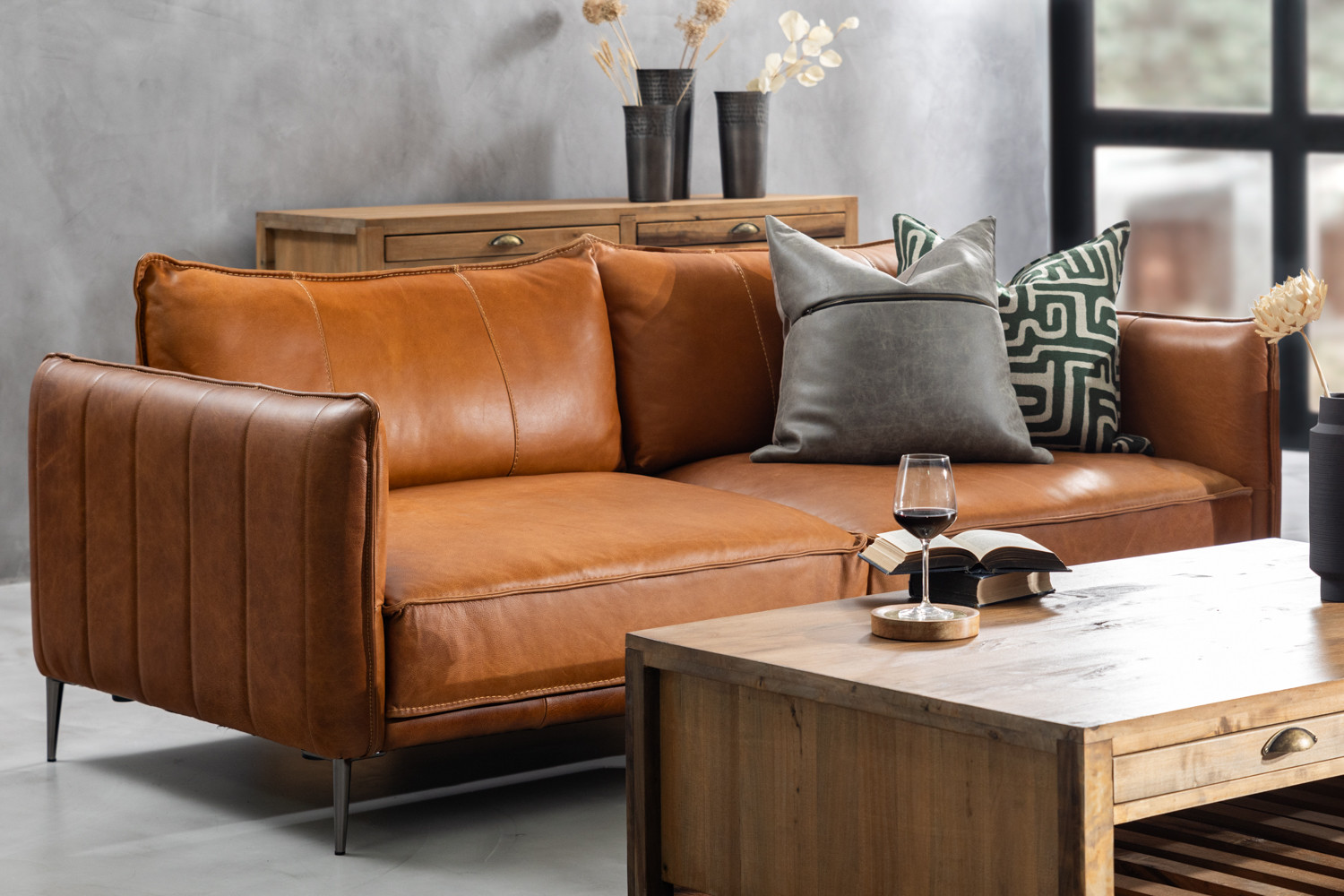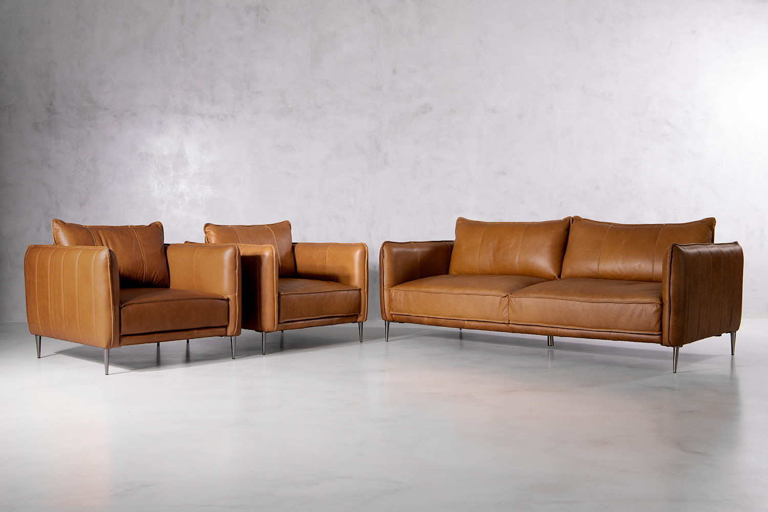 With its Mid-century modern inspired design, this spacious lounge suite emphasises easy comfort and clean lines for a simple yet elegant look. High-quality leather upholstery adds a luxurious finish, with tapered metal feet perfectly contrasting and balancing the design overall.