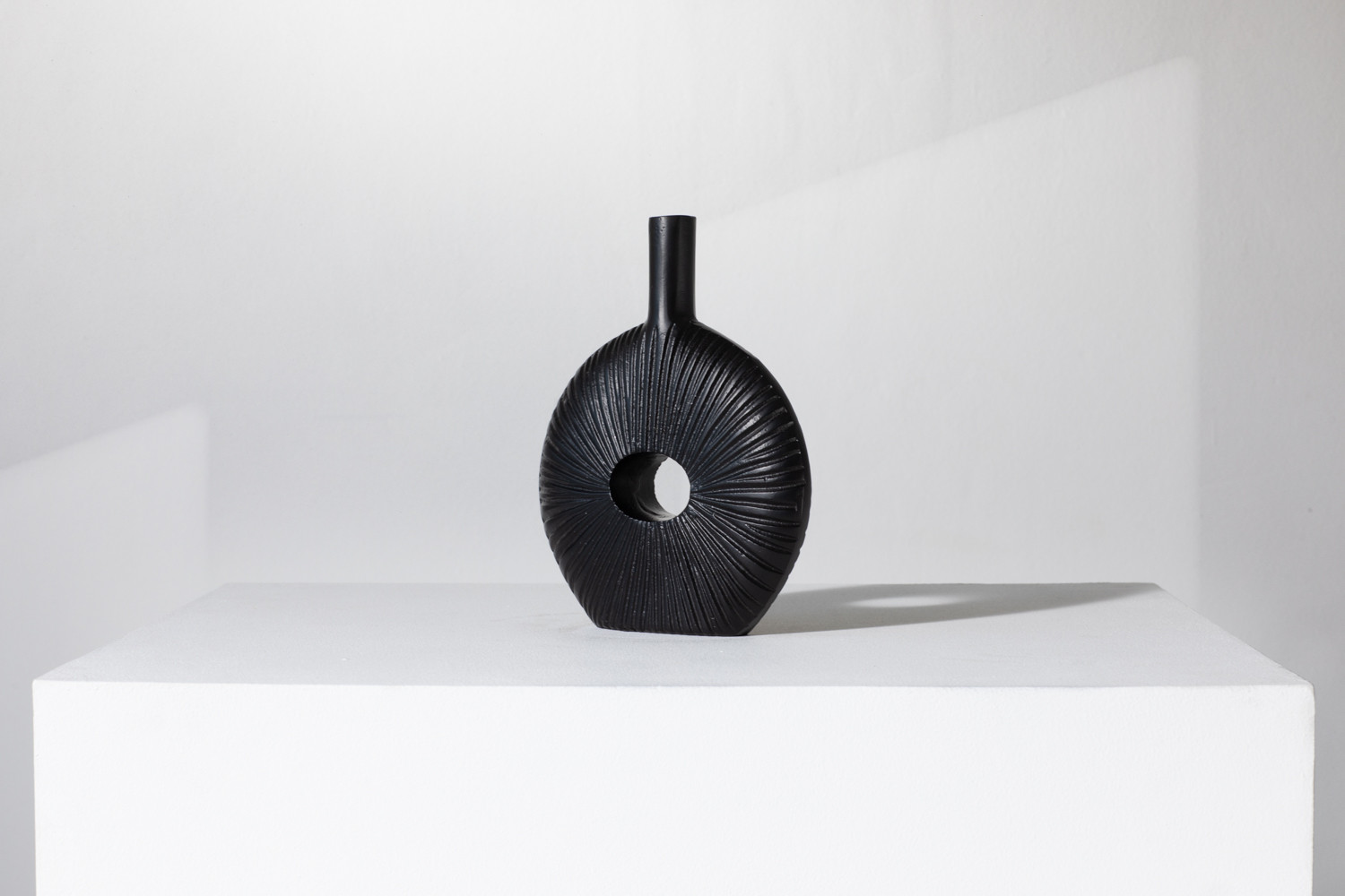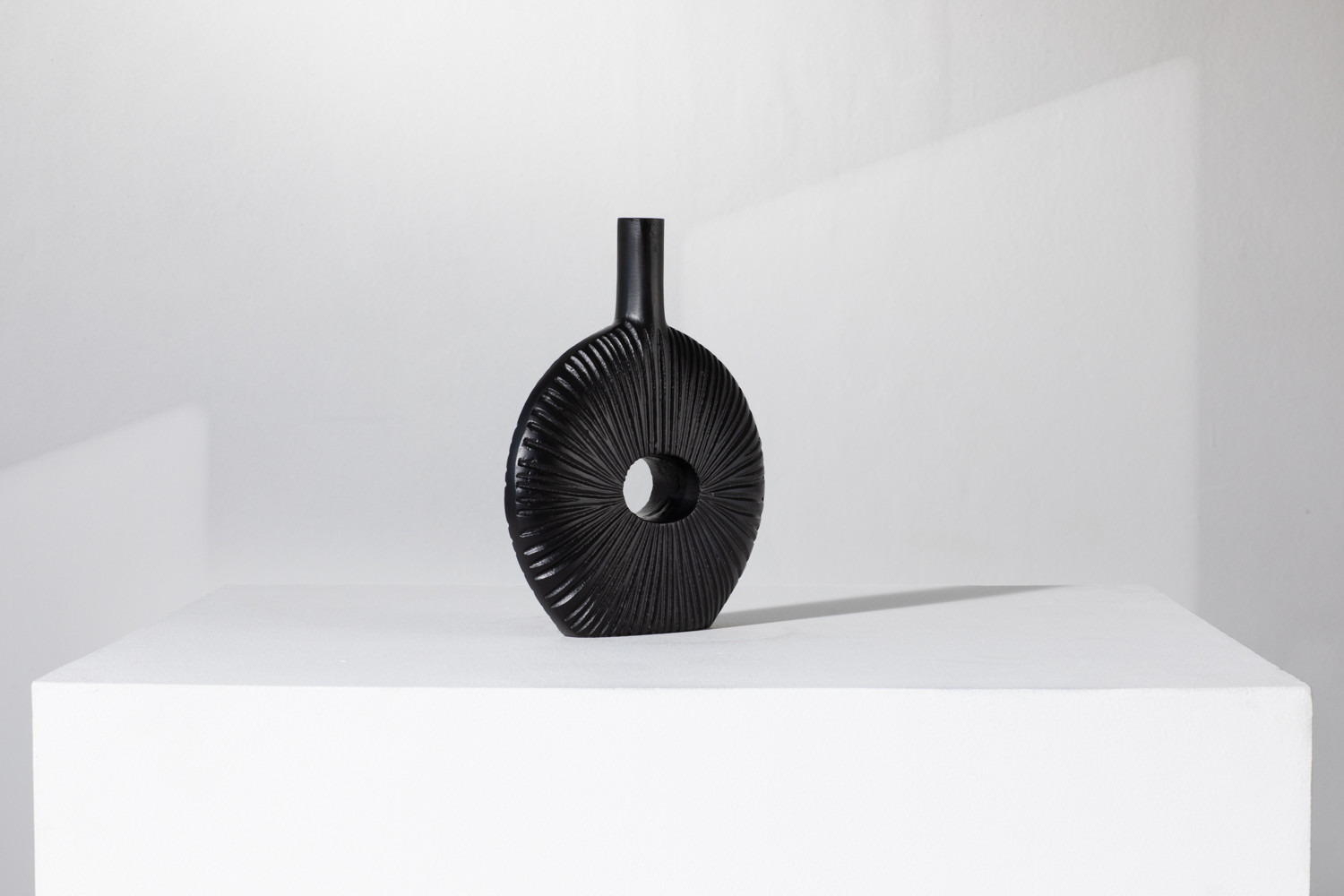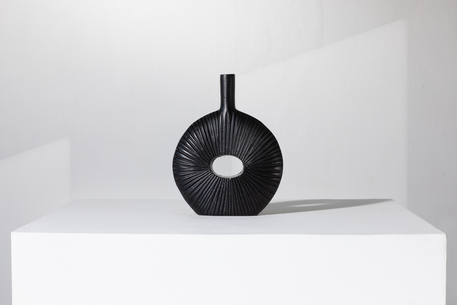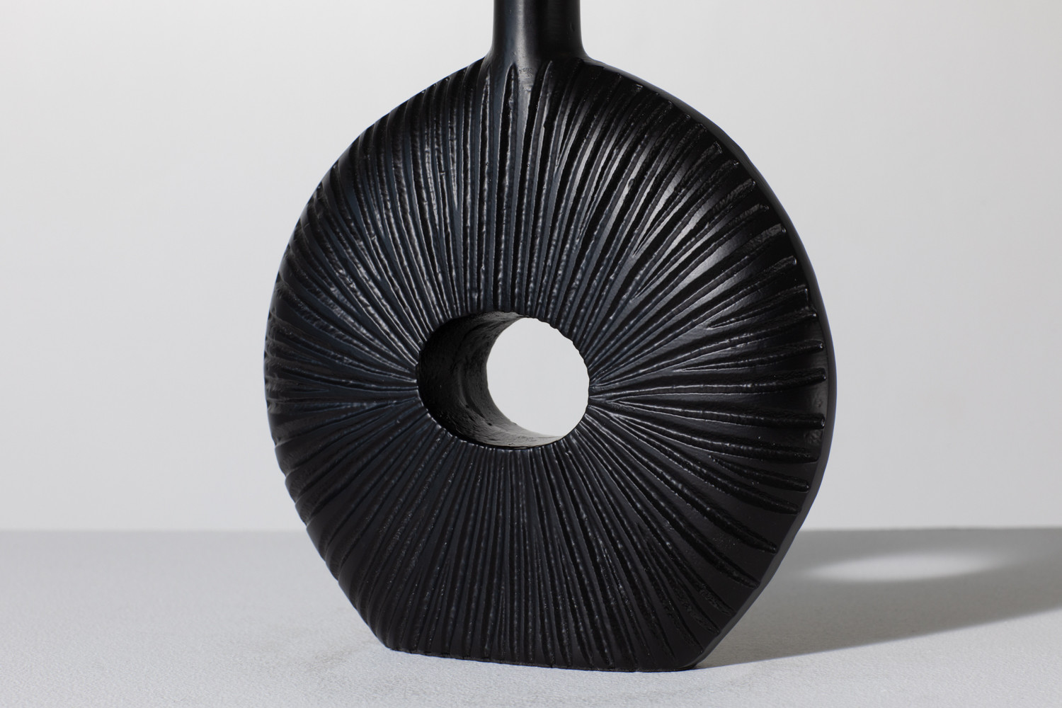 The Ovio is a uniquely crafted piece of contemporary metal decor. Its circular base features stunning textured channels that surround its hollowed-out centre.