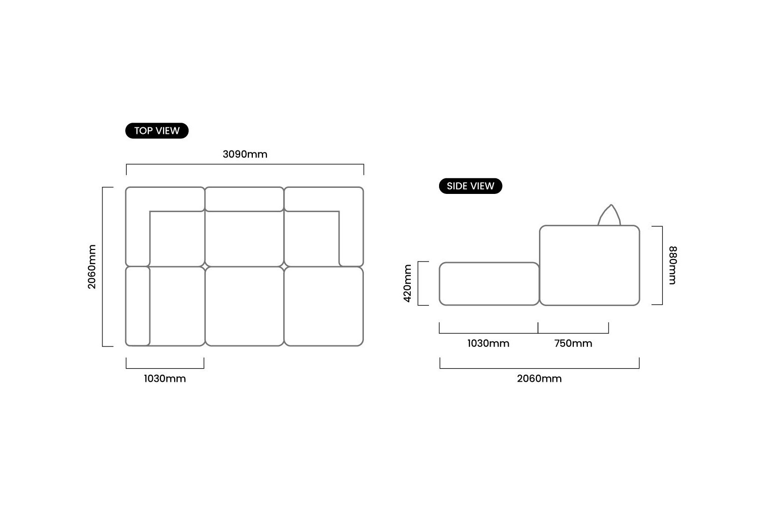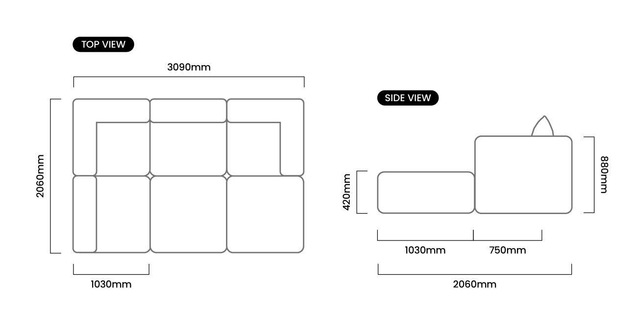 3090mm (L) x 2060mm (W) x 880mm (H) | Seat Height - 420mm | Seat Depth - 750mm