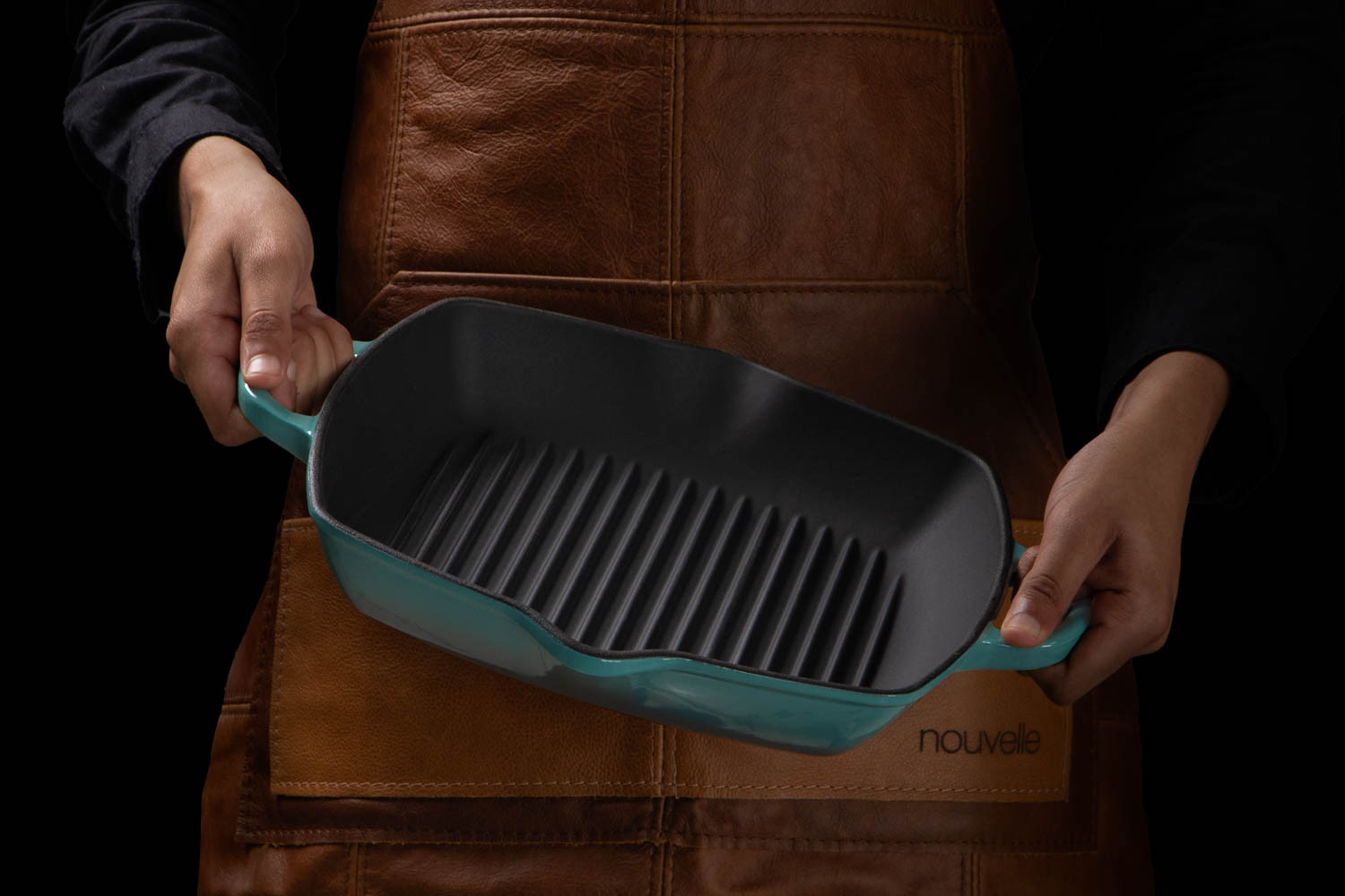 The Nouvelle Cast Iron Square Grill Pan is a culinary essential, crafted from premium enameled cast iron in a rich, vibrant hue. This durable pan features a ribbed surface for perfect grilling marks, and its sturdy handles ensure easy maneuvering. Ideal for searing and browning, it brings both function and a pop of color to your kitchen collection.