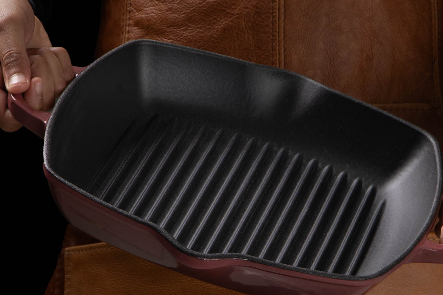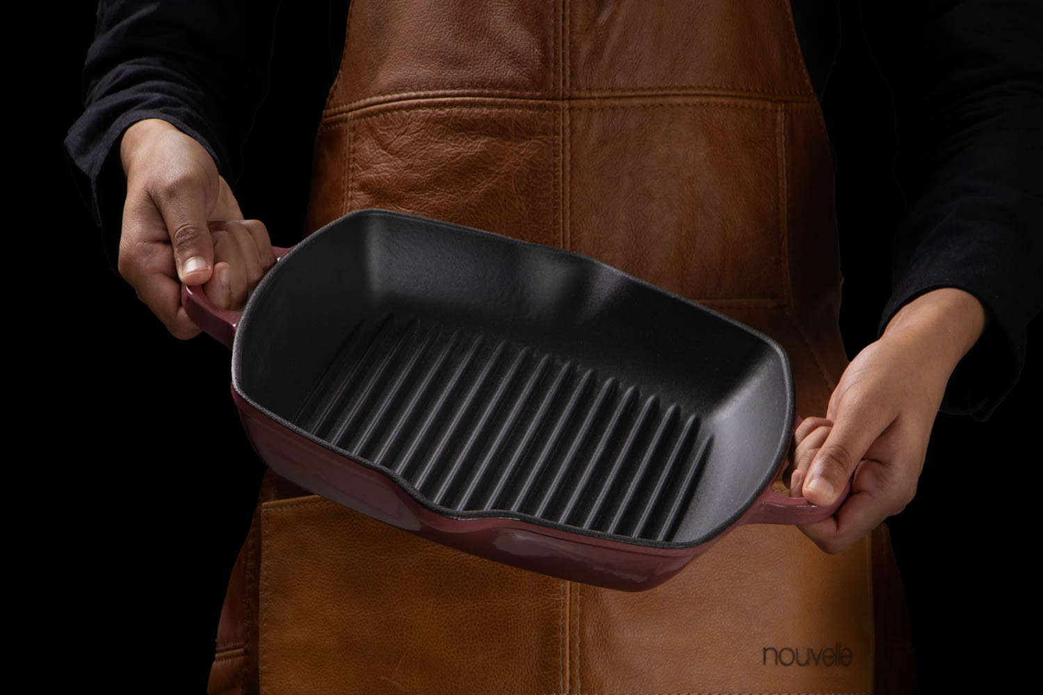 The Nouvelle Cast Iron Square Grill Pan is a culinary essential, crafted from premium enameled cast iron in a rich, vibrant hue. This durable pan features a ribbed surface for perfect grilling marks, and its sturdy handles ensure easy maneuvering. Ideal for searing and browning, it brings both function and a pop of color to your kitchen collection.