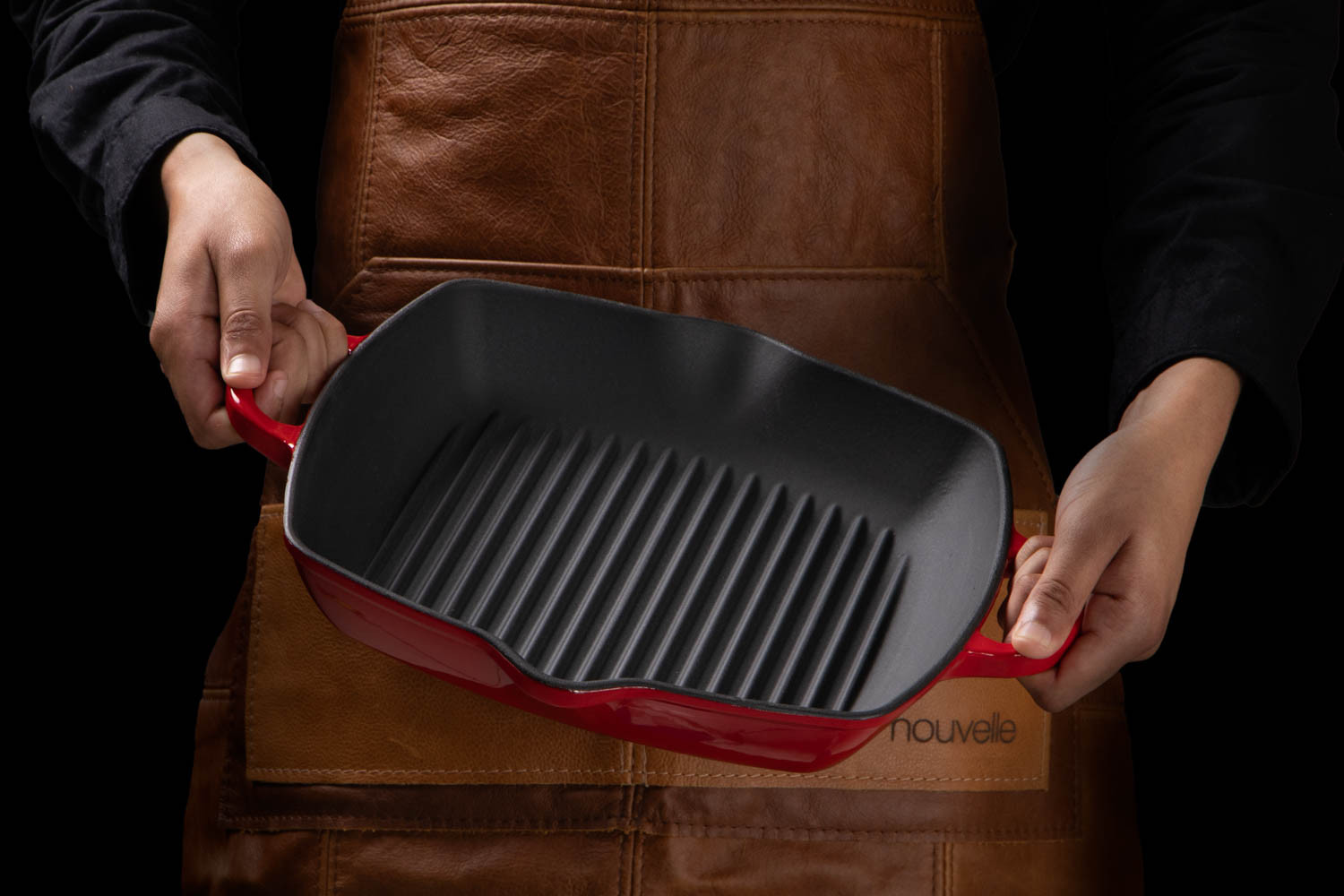 The Nouvelle Cast Iron Square Grill Pan is a culinary essential, crafted from premium enameled cast iron in a rich, vibrant hue. This durable pan features a ribbed surface for perfect grilling marks, and its sturdy handles ensure easy maneuvering. Ideal for searing and browning, it brings both function and a pop of color to your kitchen collection.