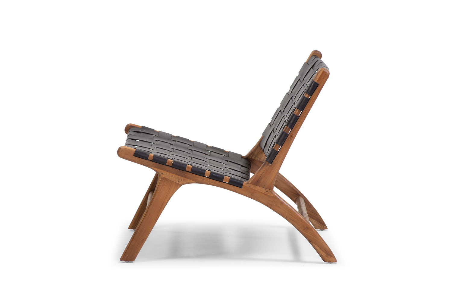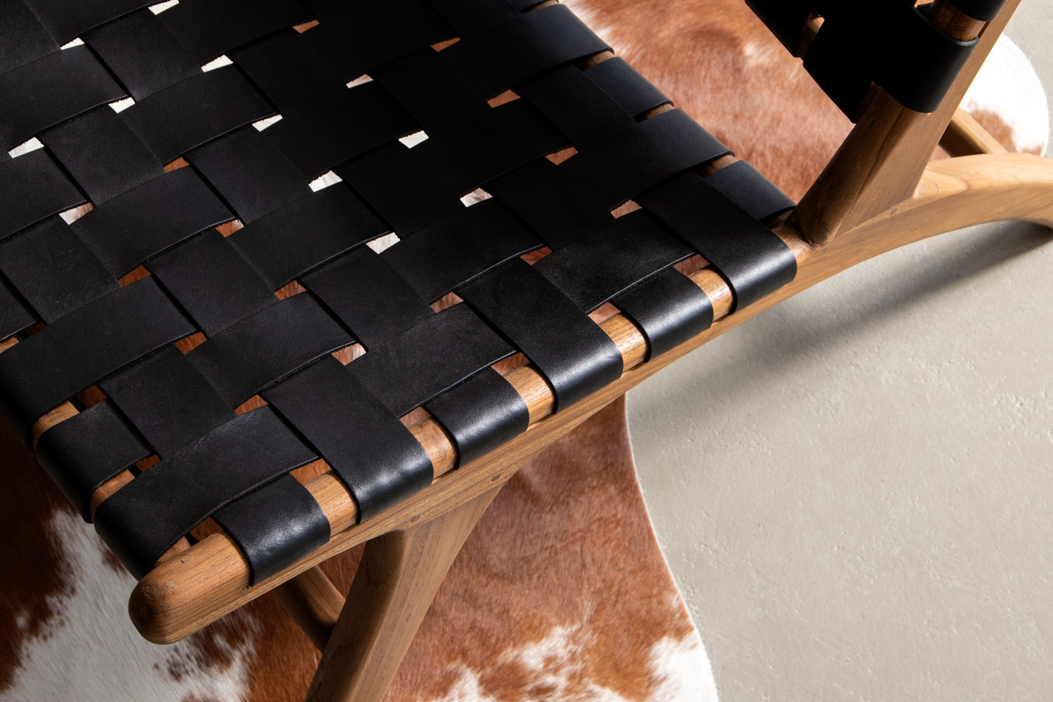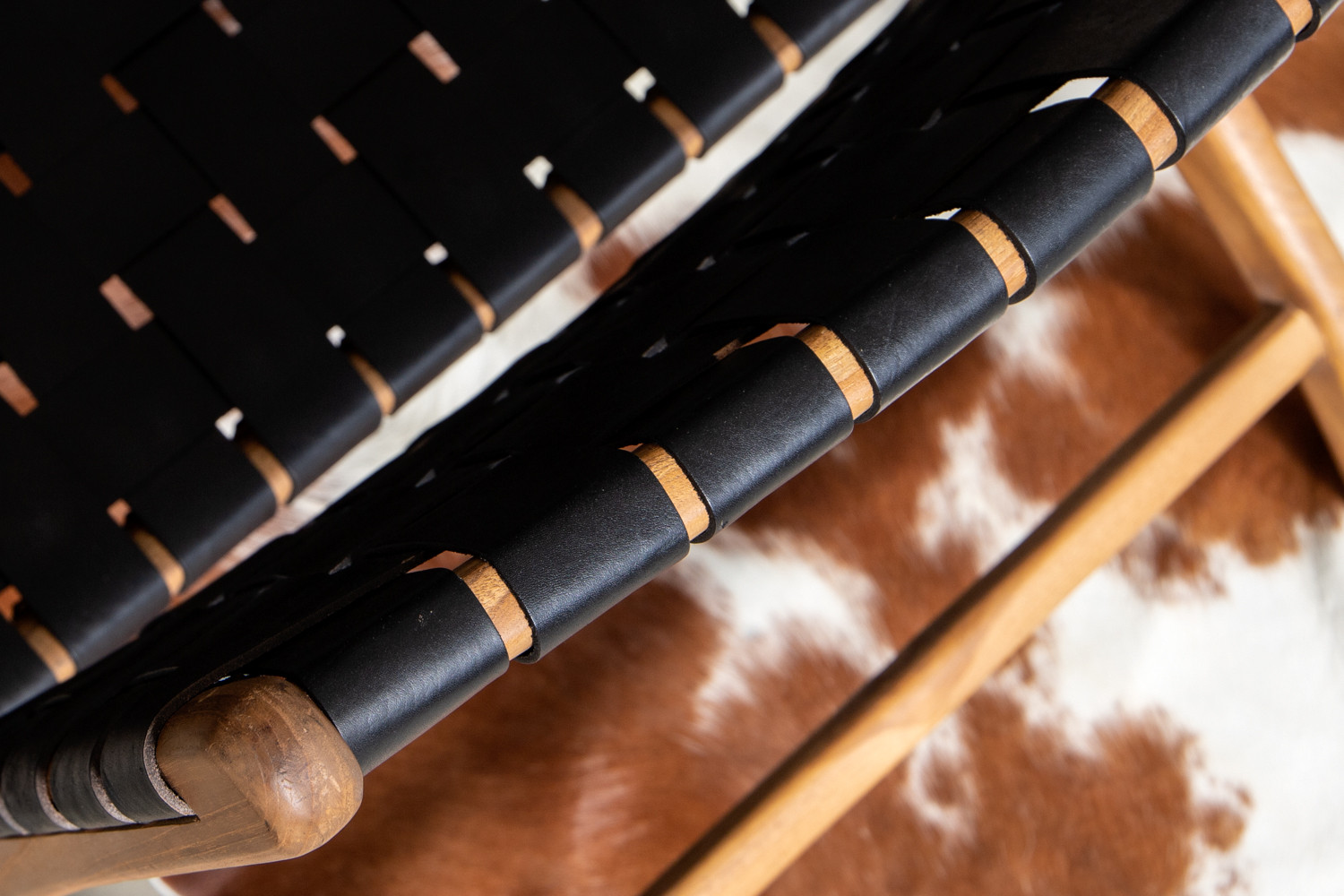 Handcrafted by Indonesian artisans, the Camdyn Leather Chair is impressive and comfortable, with a mid-century modern feel. This Chair features full-grain leather straps woven onto a solid teakwood frame, designed to add a distinct style to any setting.