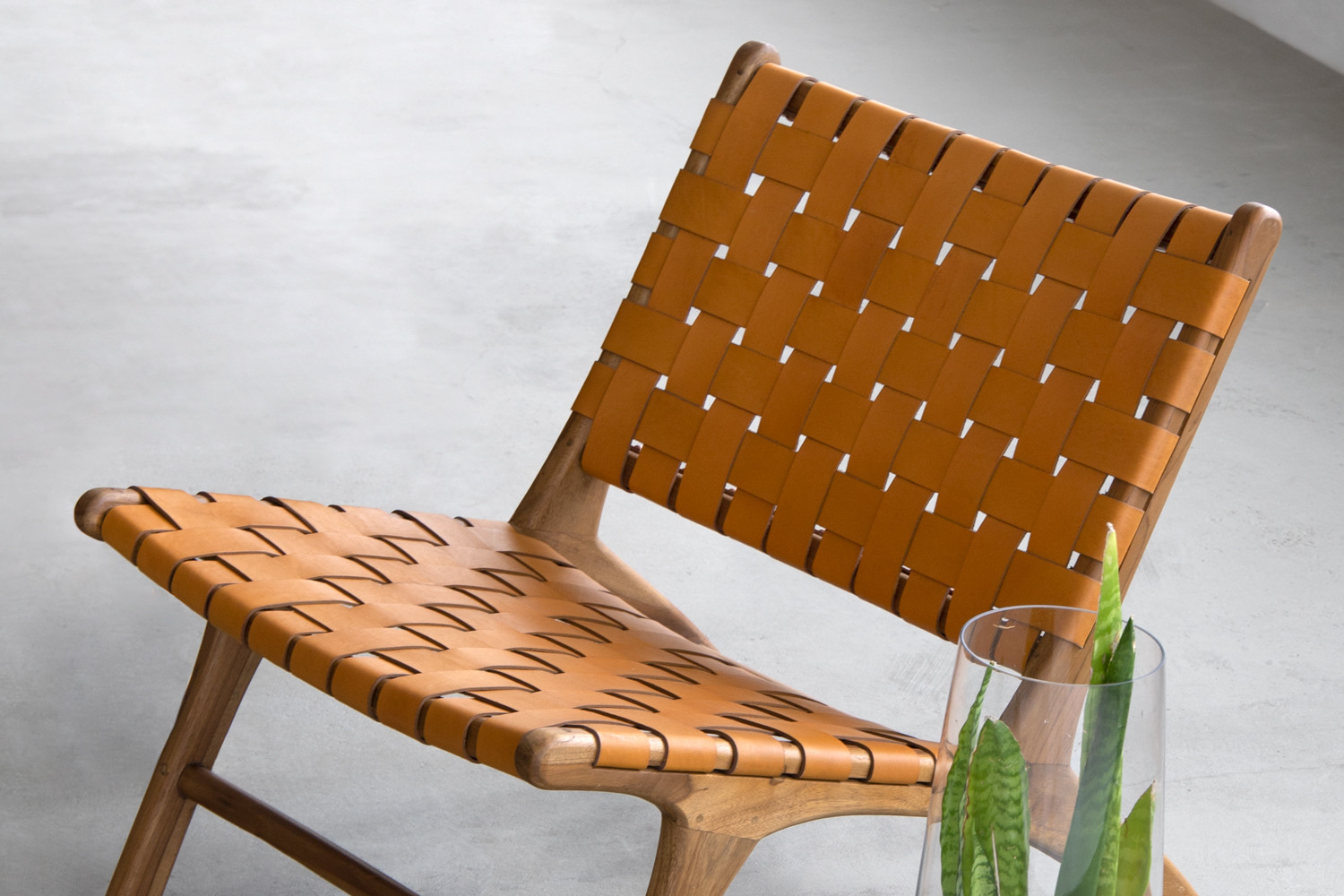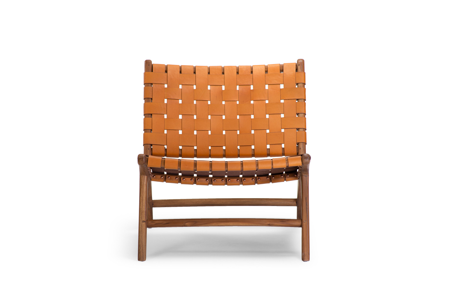 Handcrafted by Indonesian artisans, the Camdyn Leather Chair is impressive and comfortable, with a mid-century modern feel. This chair features full-grain leather straps woven onto a solid teakwood frame, designed to add a distinct style to any setting.